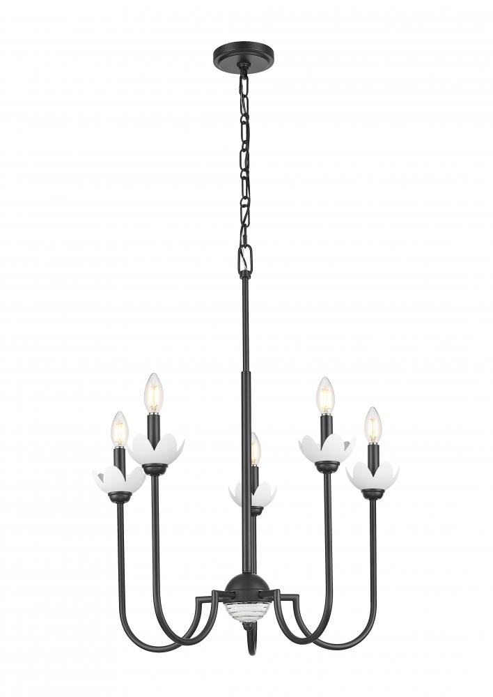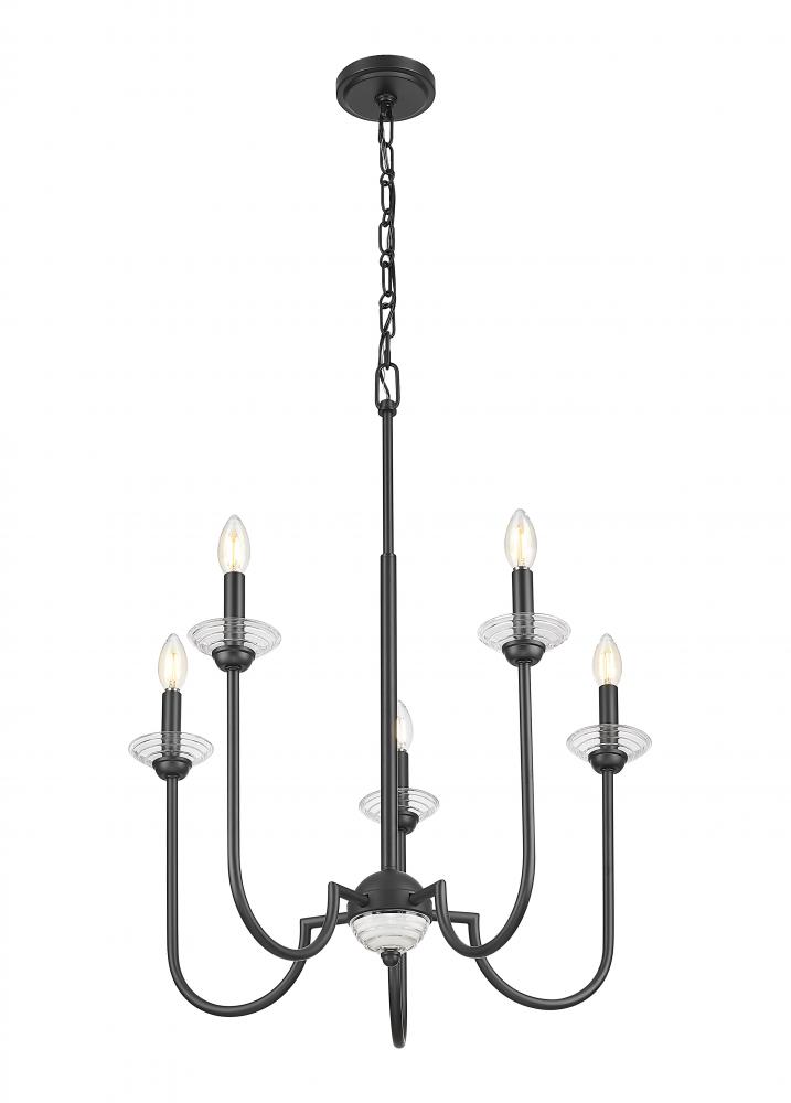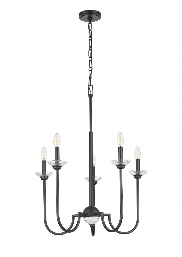 Infused with chic vintage ambiance, this transitional five-light chandelier is embellished with decorative bobeches, offered in interchangeable white metal and clear glass to create depth and contrast against a matte black finish. A glass sphere and curvy arms complete the look, which adds sparkling style over a breakfast nook, in an entry, or in your bedroom.