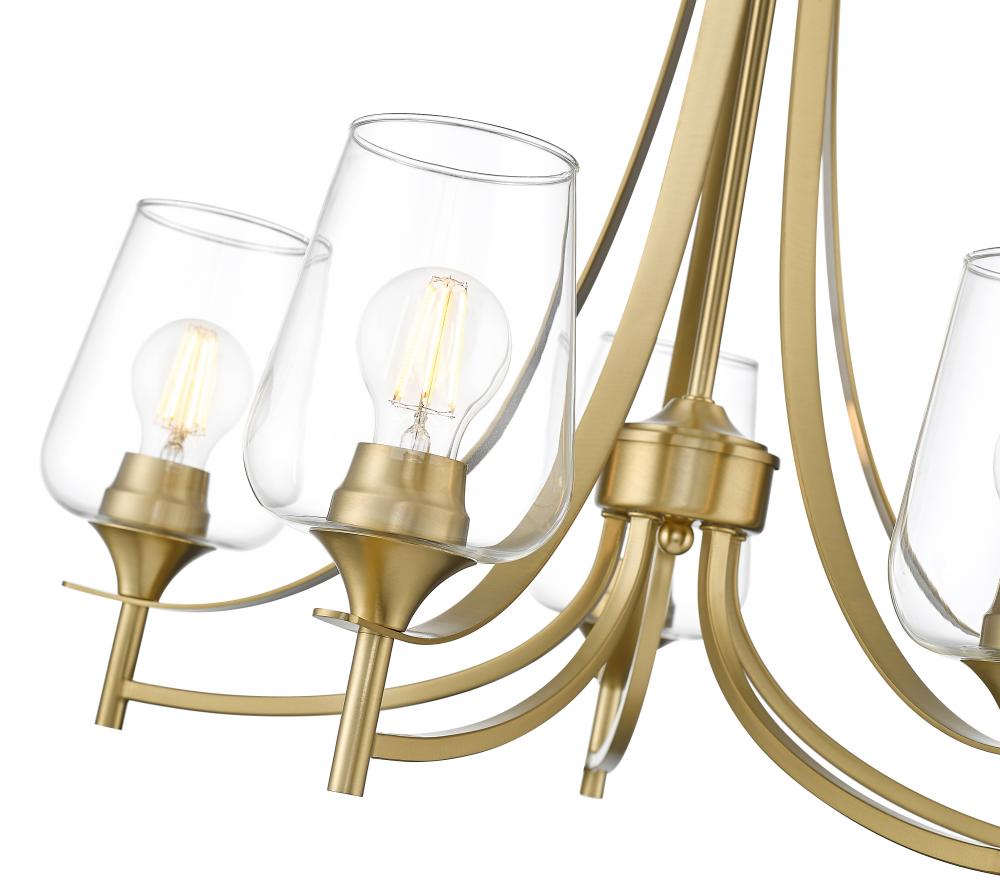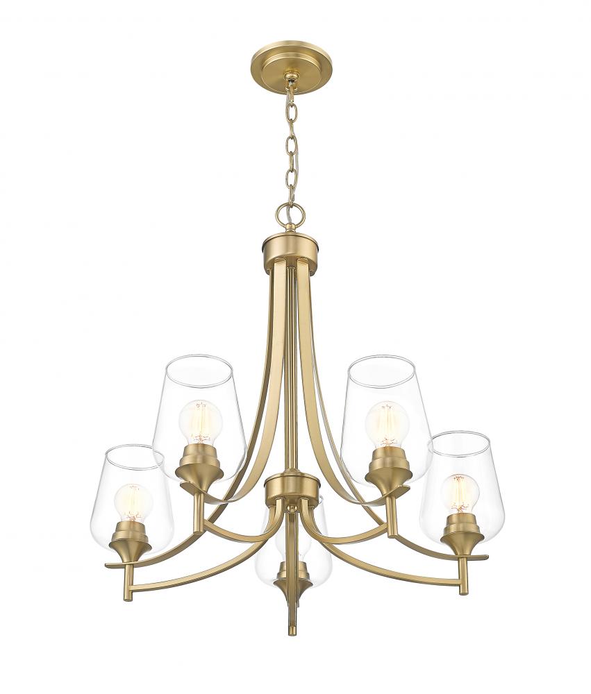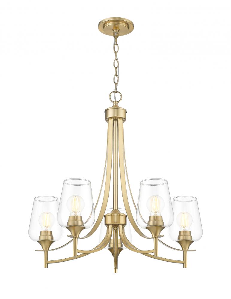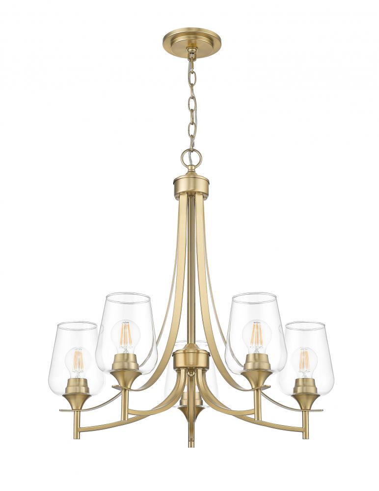 Light up a dining room or foyer with a classically elegant five-light chandelier delivering symmetry and breathtaking style. Crafted of burnished brass finish steel, its multi-part framing adds an open motif with deliciously subtle curved arms supporting delicate clear glass goblet shades. Place this dimmable fixture over dining ensembles, in living areas, and in entryways.