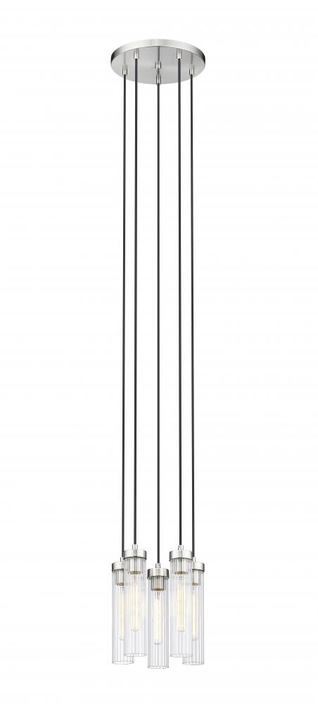 Iconic elegance is formed of a marriage between metal and glass shows gallery influence in this five-light round chandelier. Embrace the artisan glam and minimalist sensibility of a fixture featuring delicate fluted glass shades that dangle at graduated lengths from a cool brushed nickel finish metal canopy and contribute optical intrigue. This tasteful chandelier serves as a pendant for compact spaces including nooks, enclaves, and entryways.