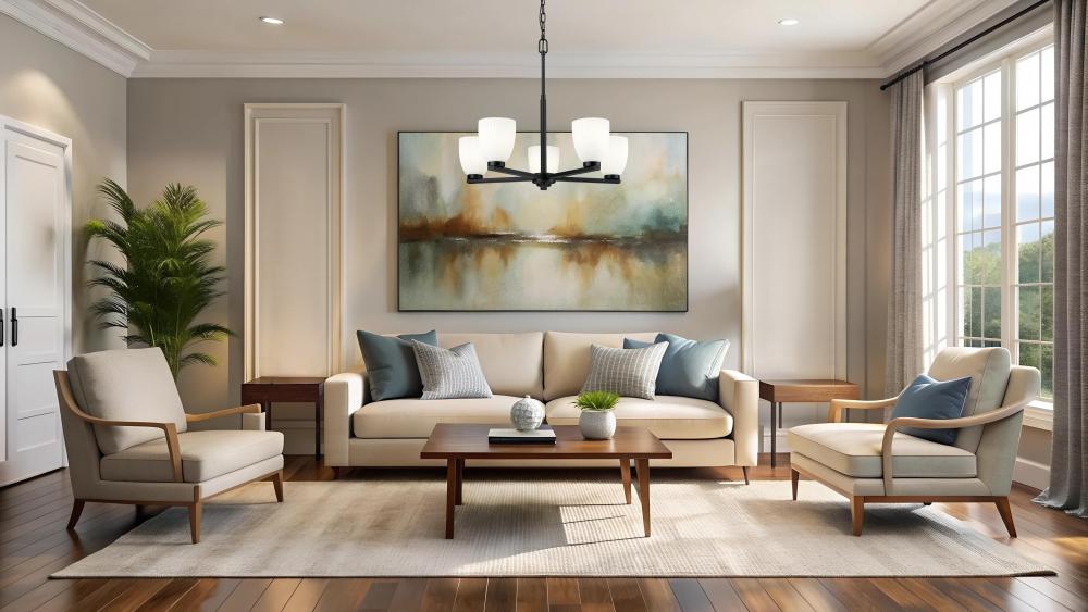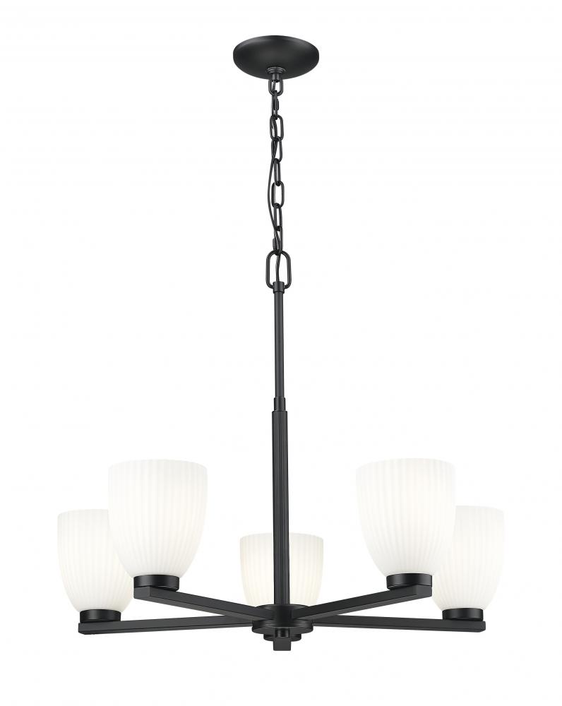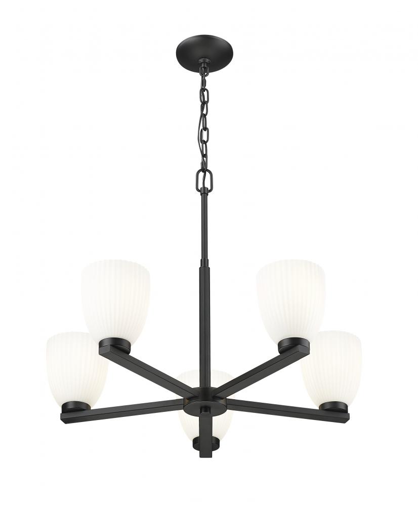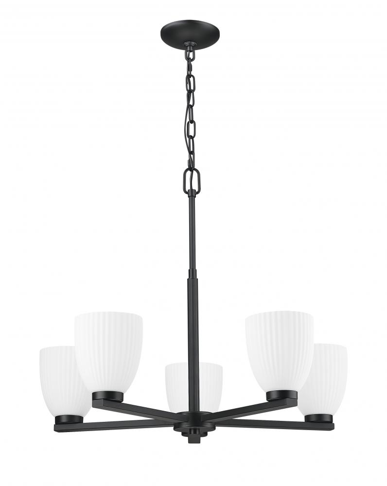 A matte black finish adds striking contrast to the soft glow of this five-light chandelier. Ribbed matte opal glass creates dimension while keeping the light gentle and evenly cast. Designed for presence without heaviness, it brings modern simplicity to the heart of the room.