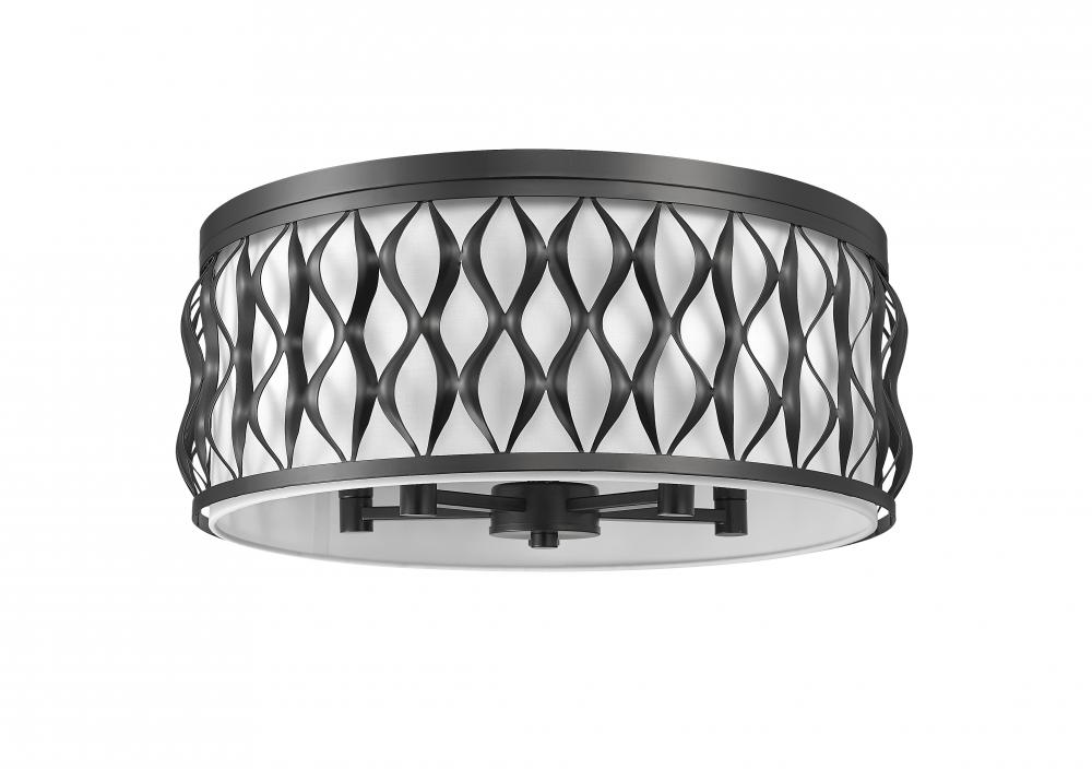 Embrace an iconic style motif in a sculptural and fashion-forward five-light flush mount ceiling light constructed of bold matte black finish steel. Living rooms, dining spaces, and foyers receive a timeless aesthetic with a drum-shaped fixture featuring symmetrical ribbon waves cascading vertically, banded on both edges. A white diffuser filters glowing light, creating superb optical ergonomics.