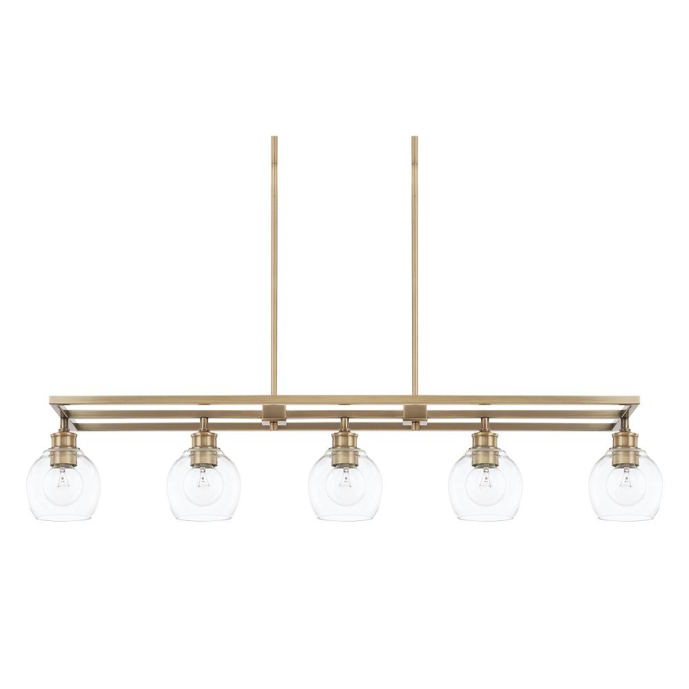 Clean, Uncluttered Design Defines The Mid-Century 5-Light Island, Perfect For Illuminating A Breakfast Bar, Dining Table Or Kitchen Island. Finished In Aged Brass, This Fixture Goes Well With Other Gold-Toned Accents And Hardware And With Both Lighter And Darker Woods. Clear, Rounded Glass Allows Unhindered Visual Flow And Understated Elegance, True To Mid-Century Aesthetics.