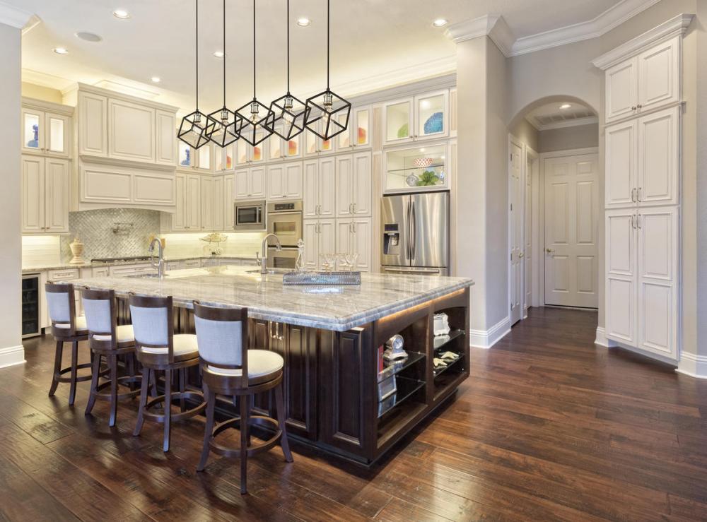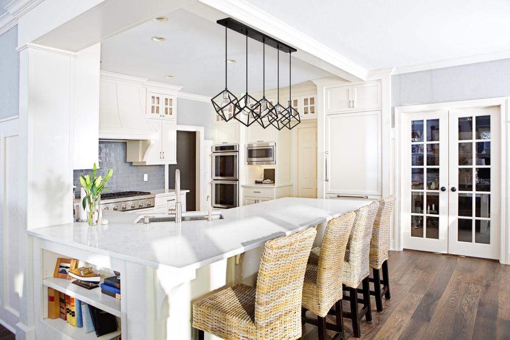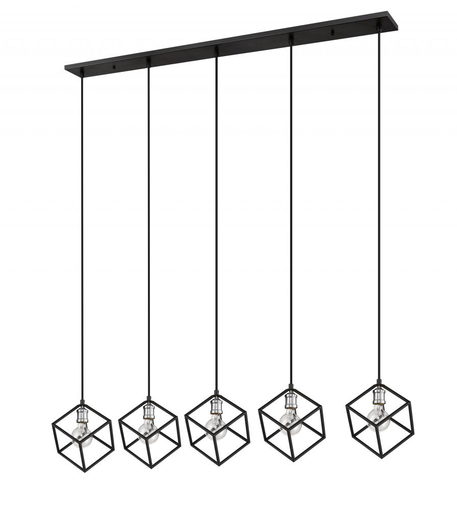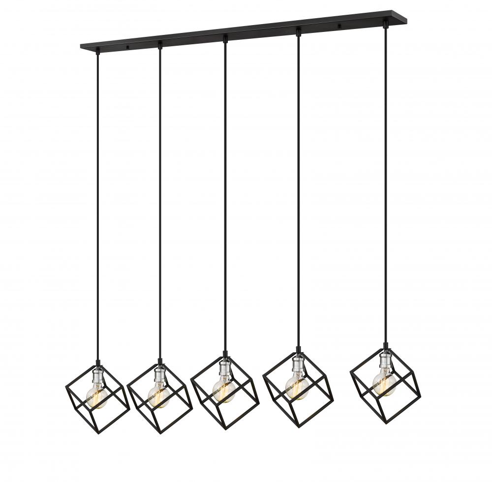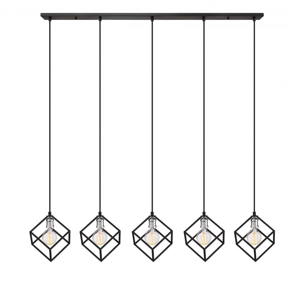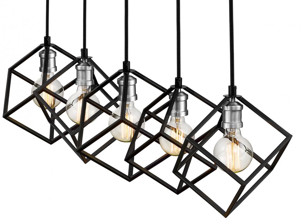 Balance and harmony combine with clean, modern lines in this two-tone five-light island/billiard light for your home. Its fashioned in a matte black and brushed nickel finish with cube-shaped shades for a look thats contemporary yet timeless. Its a dynamic design that catches the eye in any dining room, foyer, kitchen, or entertainment room.