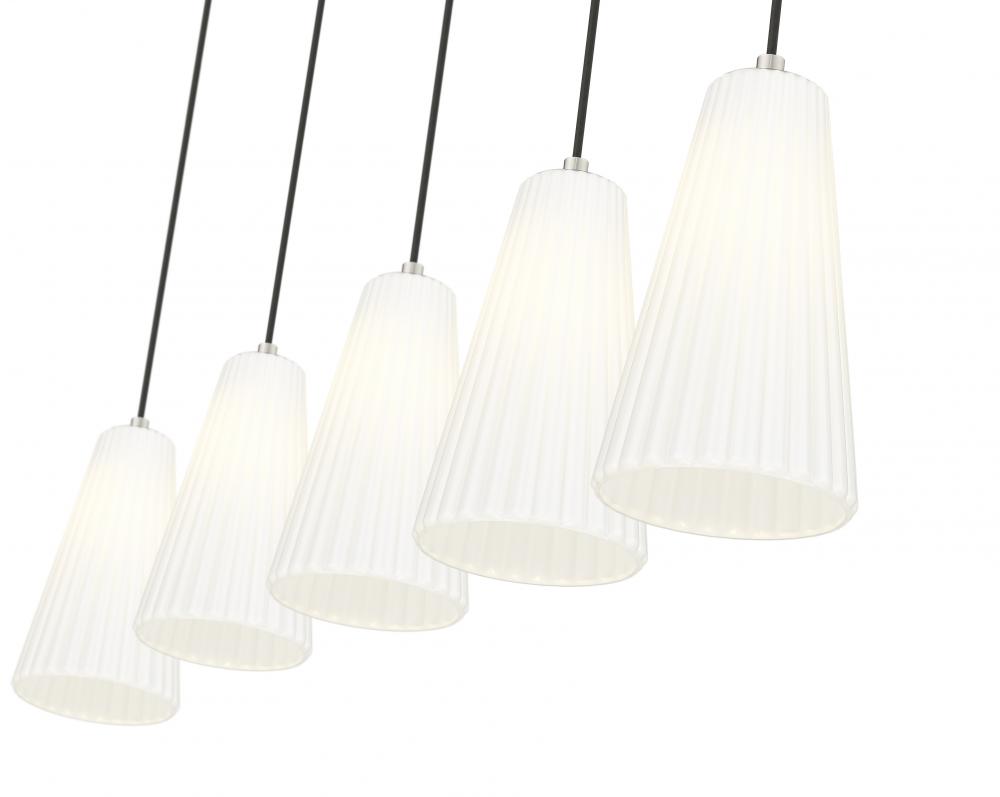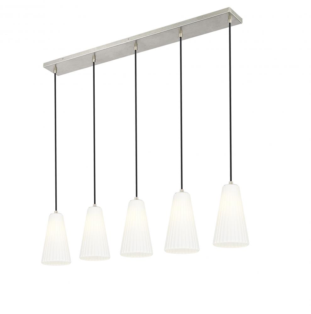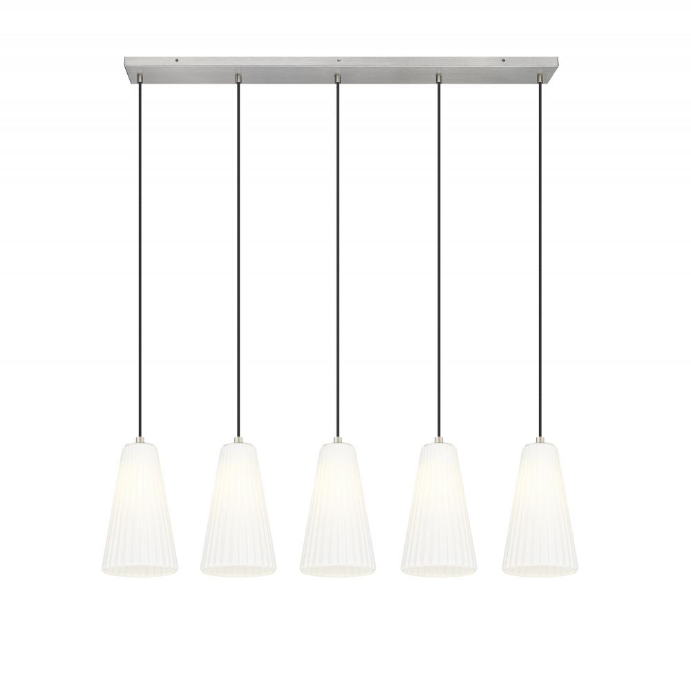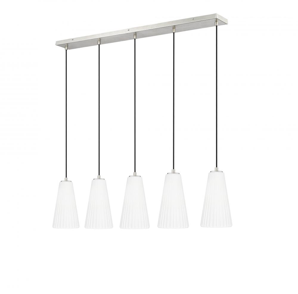 Luminous fluted white glass creates a fresh, refined look for this modern five-light island chandelier. The linear design is crisp and functional, offering beautiful illumination and a lovely brushed nickel finish over its sleek-lined silhouette. Clean and crisp, the linear chandelier brings effortless sophistication to any setting.