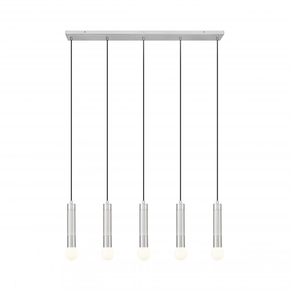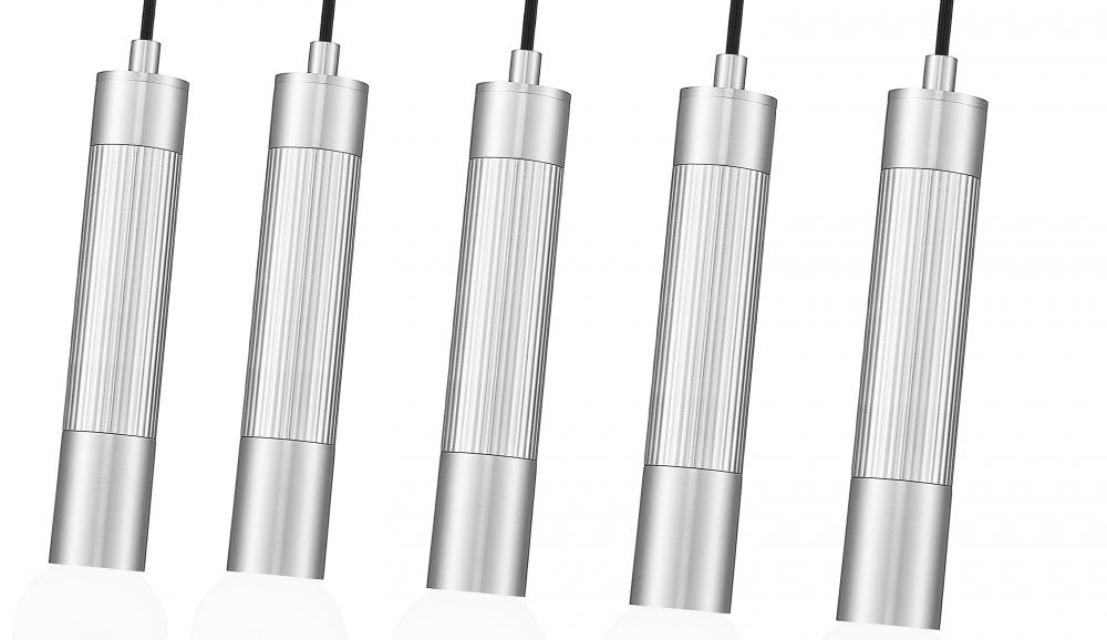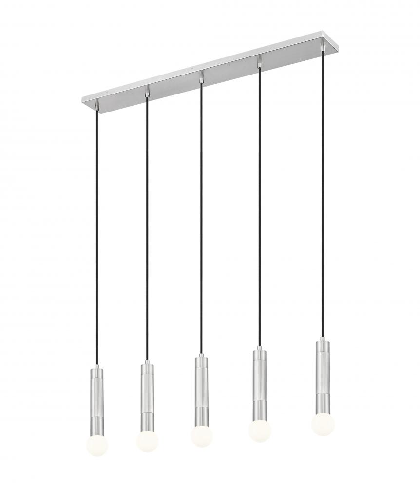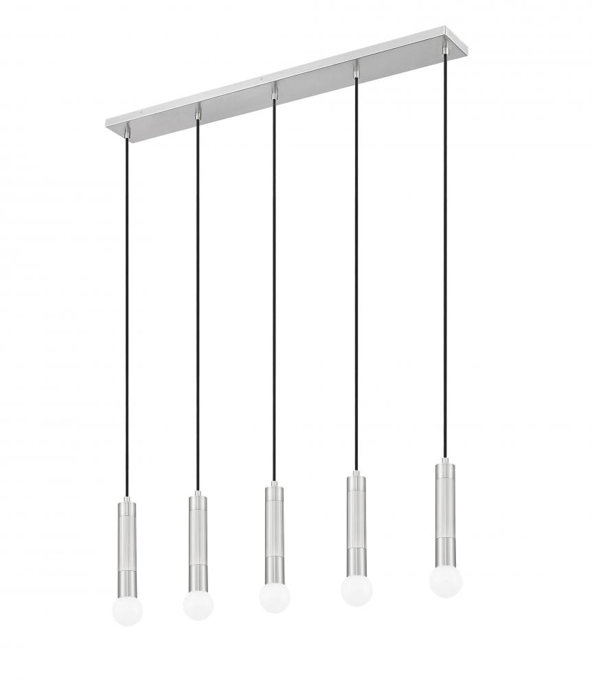 Brighten a kitchen island or family dining table with the easy minimalism of this modern five-light linear chandelier. Each light features a braided cord and an elongated tube, casting bright, inviting ambiance perfect for daily living or entertaining. A brushed nickel finish graces the steel frame, offering versatile style and sophistication.