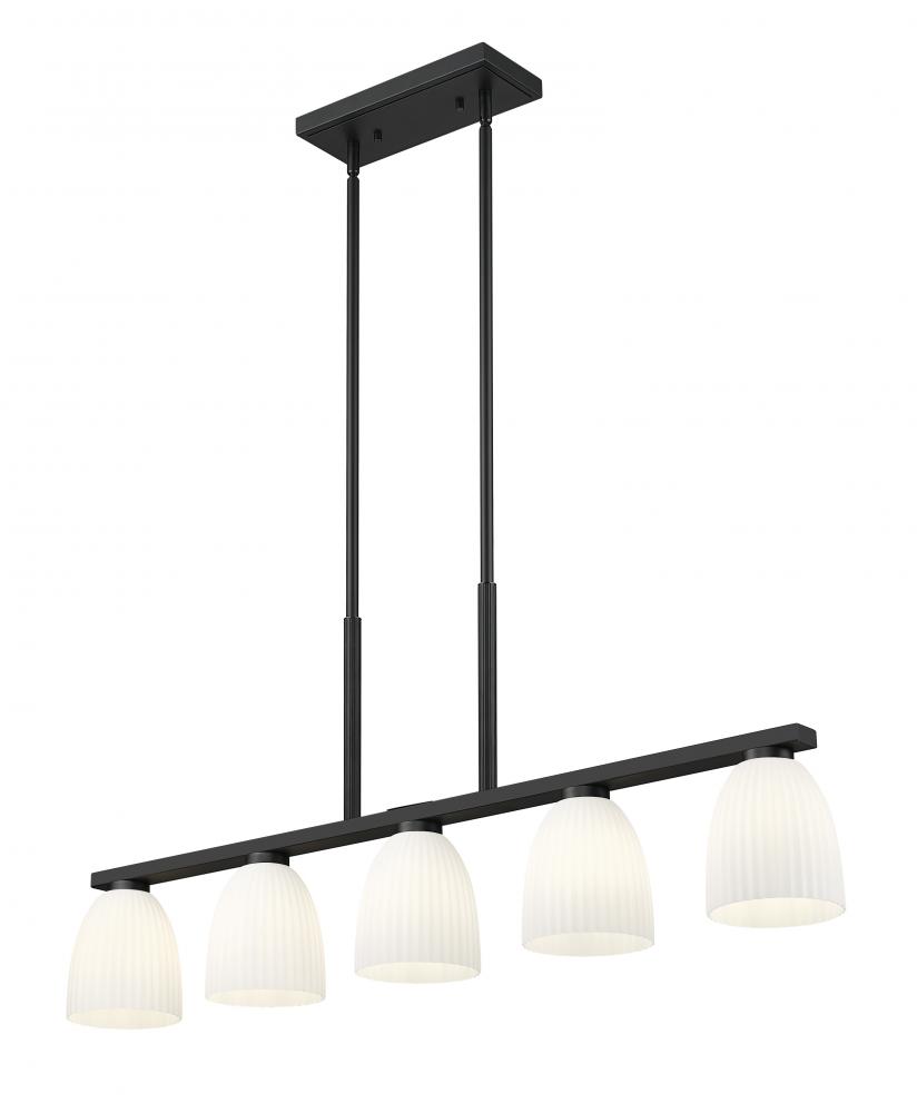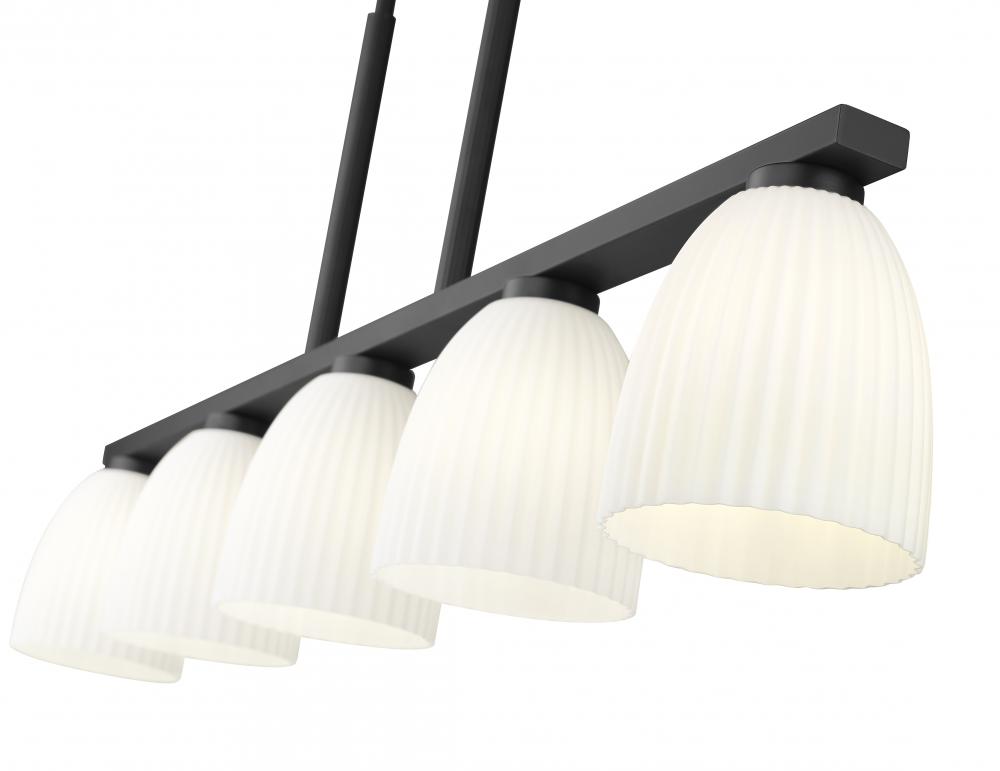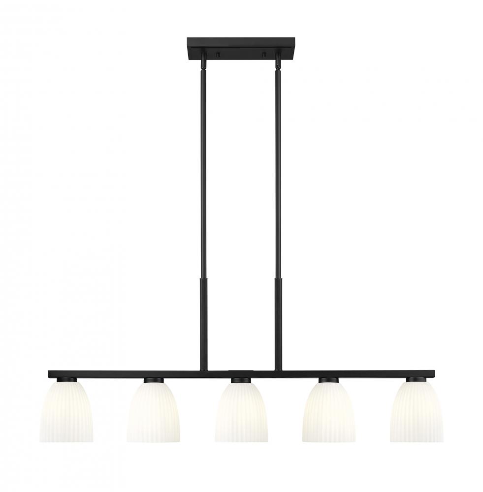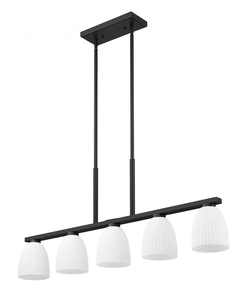 With its elongated silhouette and matte black finish, this five-light linear chandelier creates bold contrast above dining tables or kitchen islands. Ribbed matte opal glass shades lend softness to its striking lines, diffusing the light in warm, ambient layers. It?s a perfectly proportioned piece that balances form and atmosphere.