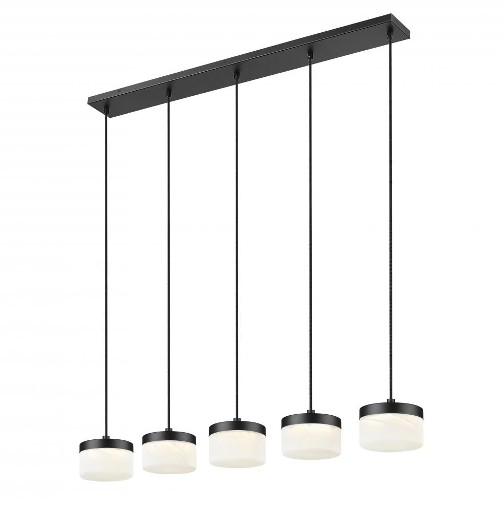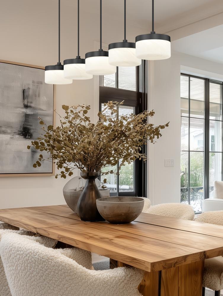 Slim cords suspend this matte black 5-light linear LED chandelier in a precise row that outlines the length of a kitchen island or family table. Used on its own in a narrower space or paired with recessed lighting in a larger room, it adds definition and an assured sense of style.