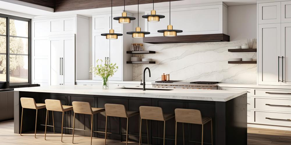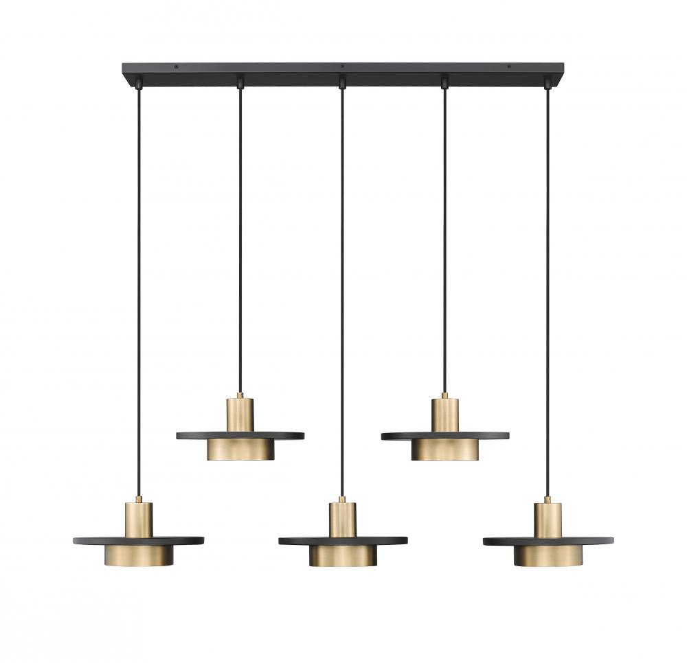 An aesthetically charming look appeals to geometric shaping in a five-light linear chandelier ideal for casual settings. Staggered rows of modern gold finish luminaires combine basic shades on holders sandwiching matte black disk elements, creating an iconic palette. Highlight horizontally oriented islands and other venues with a catchy multi-light LED fixture offering mood-altering dimmable lighting.