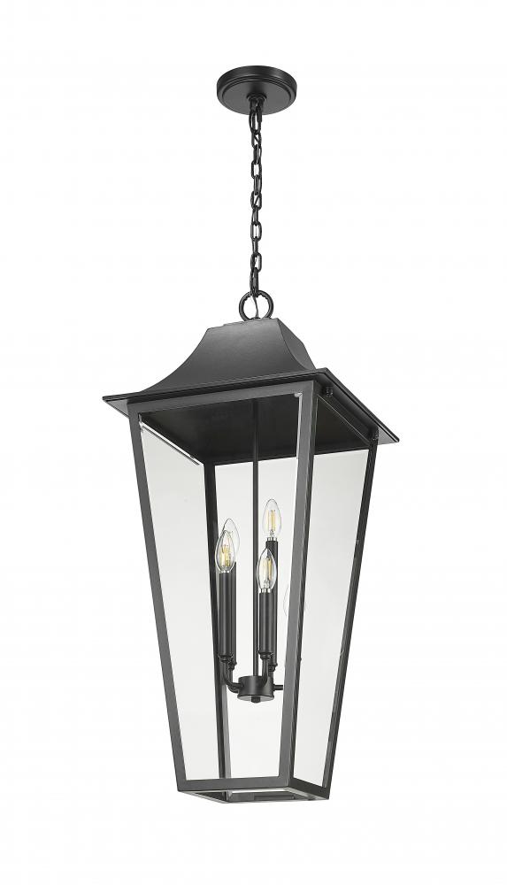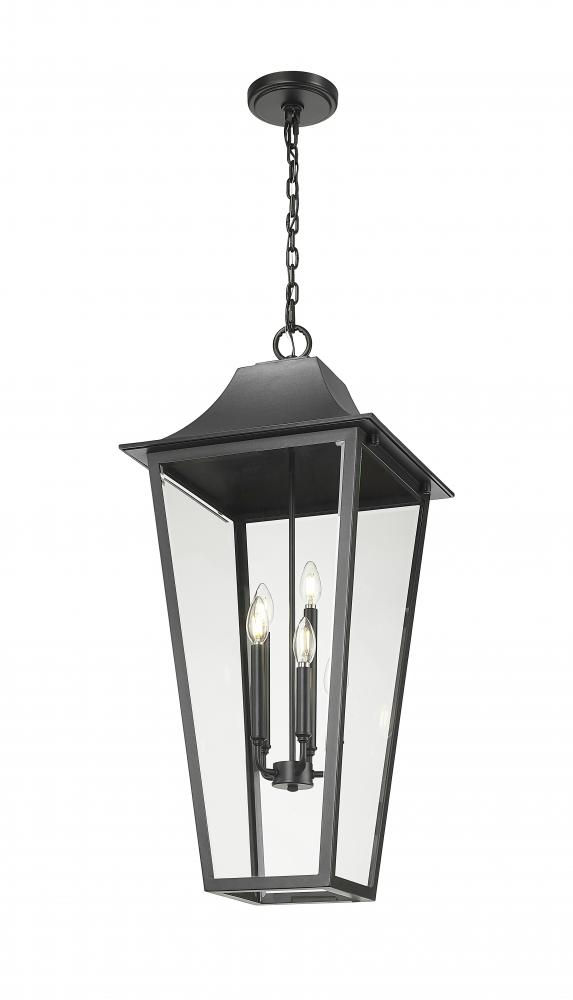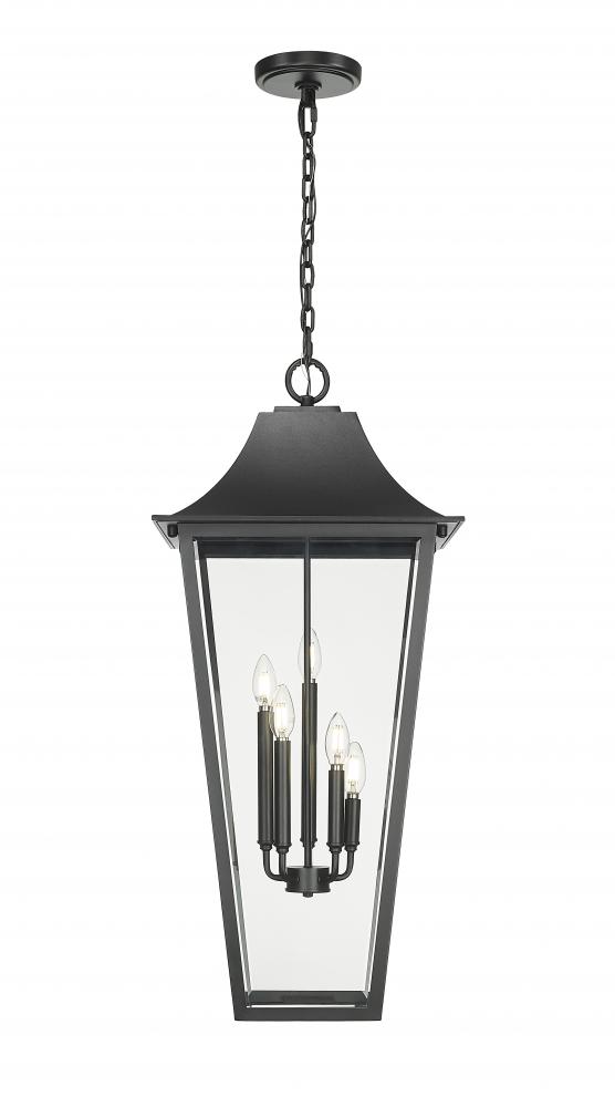A timeless lantern with an elongated profile brings a modern twist to a traditional five-light outdoor hanging light. A charming choice over a front entry or patio living room, it showcases a classic look complete with a durable Coastal black finish and glass panels that add protection for a grouping of candelabra lights within.
