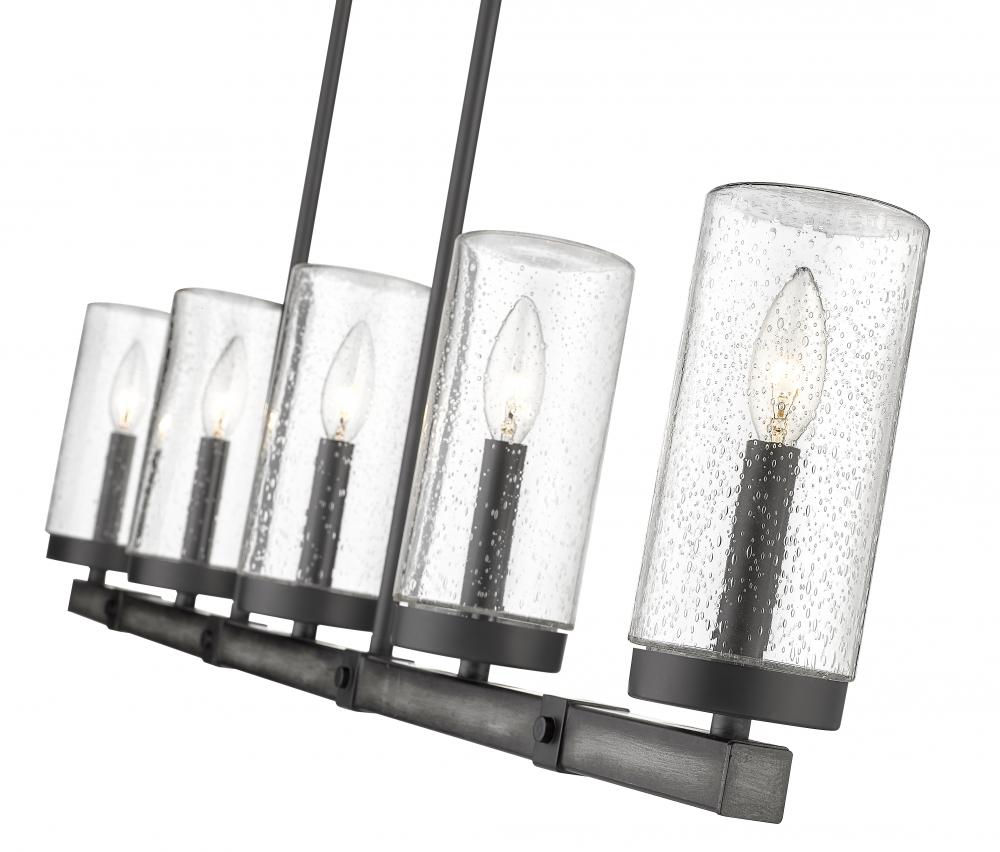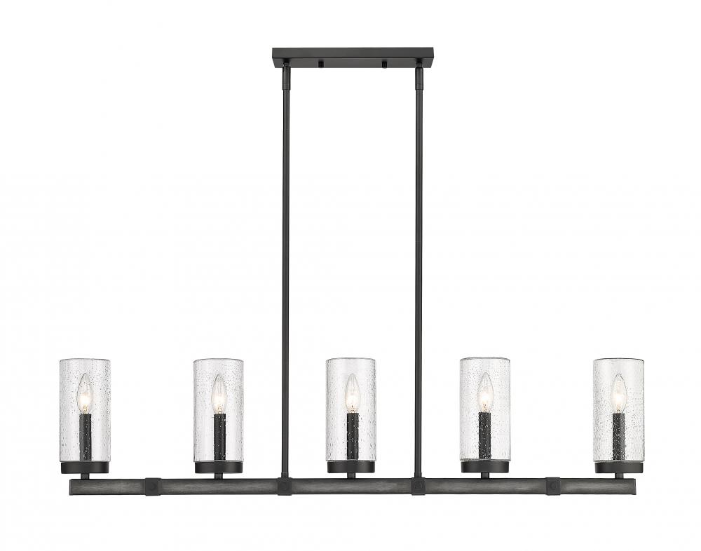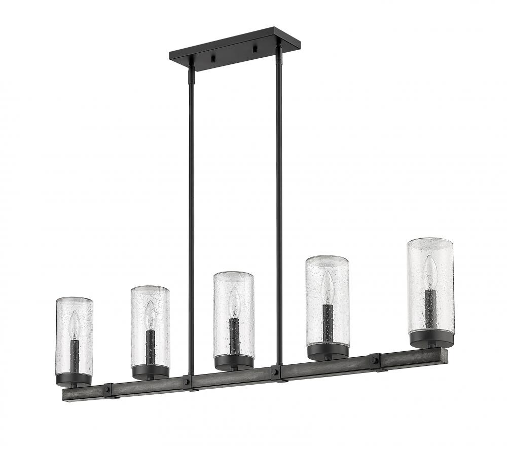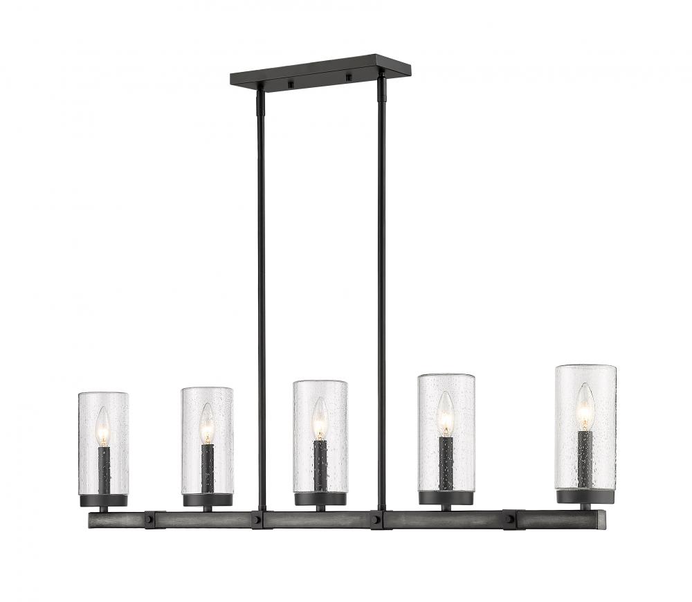 Adopting a sleek linear design, the Marlow five-light outdoor linear light creates an island chandelier effect that moves to covered patios and gazebos. Sophisticated minimalism reflects in a fixture featuring a steel frame with an ashen barnboard finish with matching accents. Cylinder shades fashioned of romantic seedy glass dress up its romantic attitude, offering a filtered view of candelabra-style bulbs.