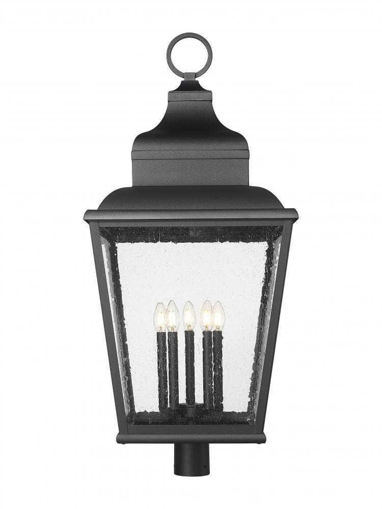A twist on iconic lantern-inspired design, this five-light outdoor post mount fixture enhances residential or commercial exterior settings with a village motif. Sand black finish aluminum crafts a tapered frame with a tall, detail-rich roof, as clear seedy glass panels inspire with a bit of romance. Candelabra-style holders reflect a romantic ambience in a dimmable light perfect for round-the-clock illumination.