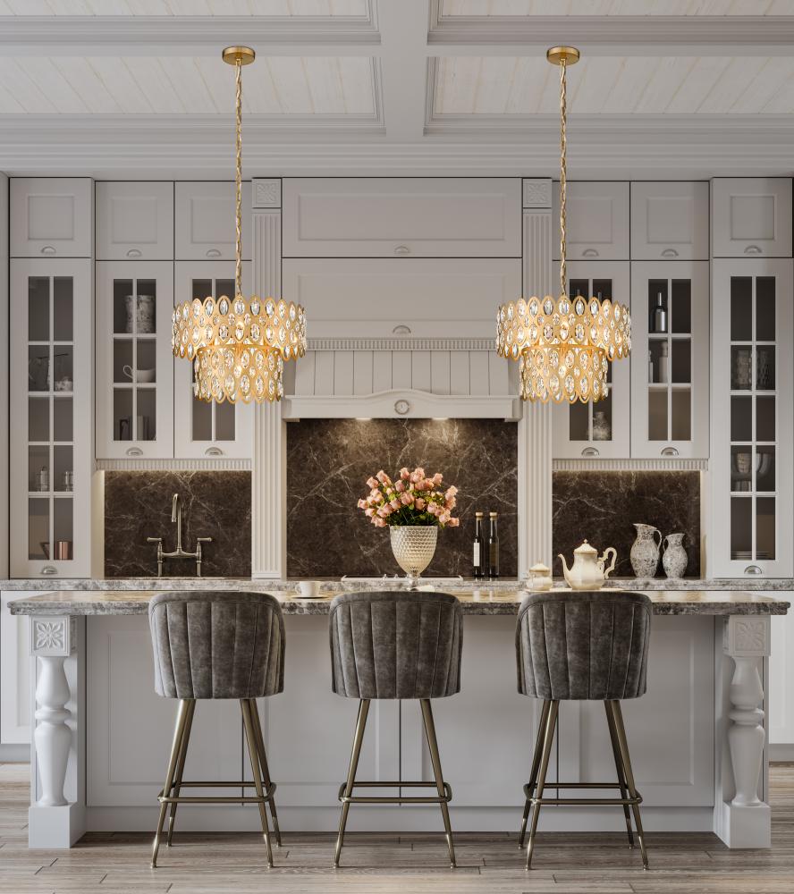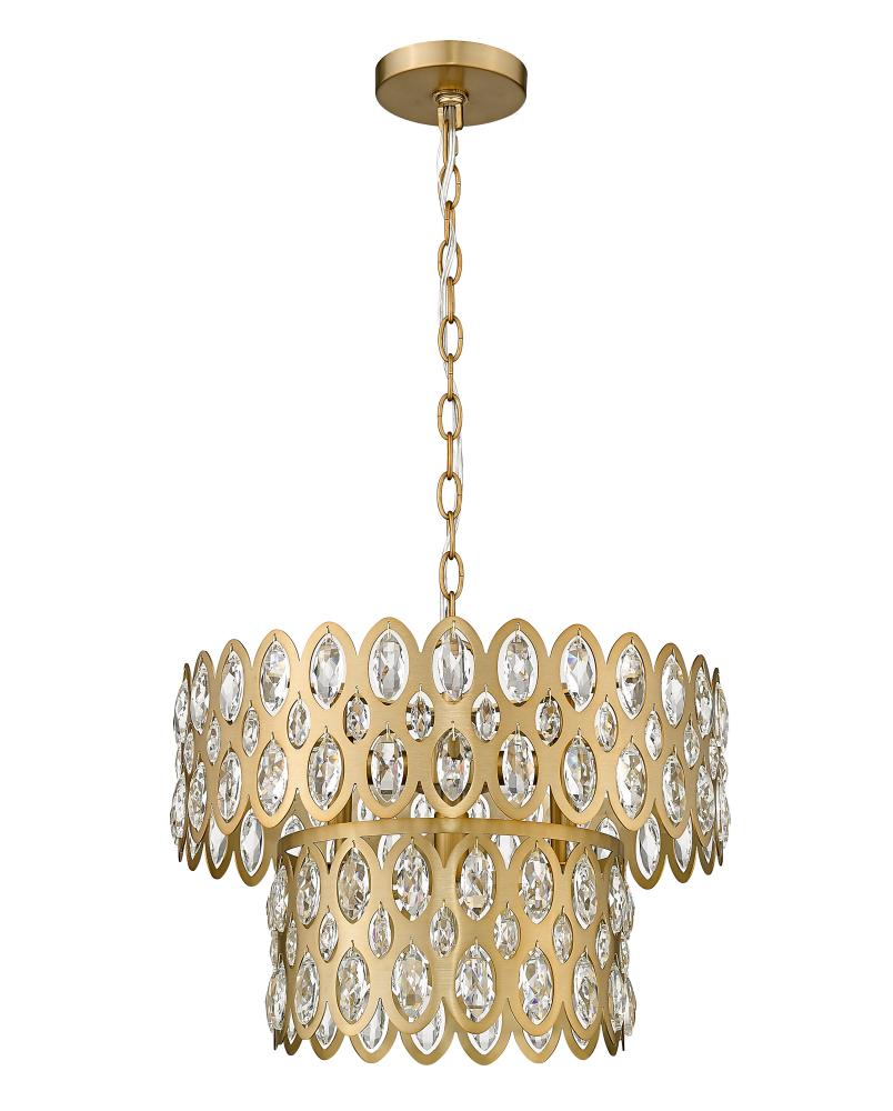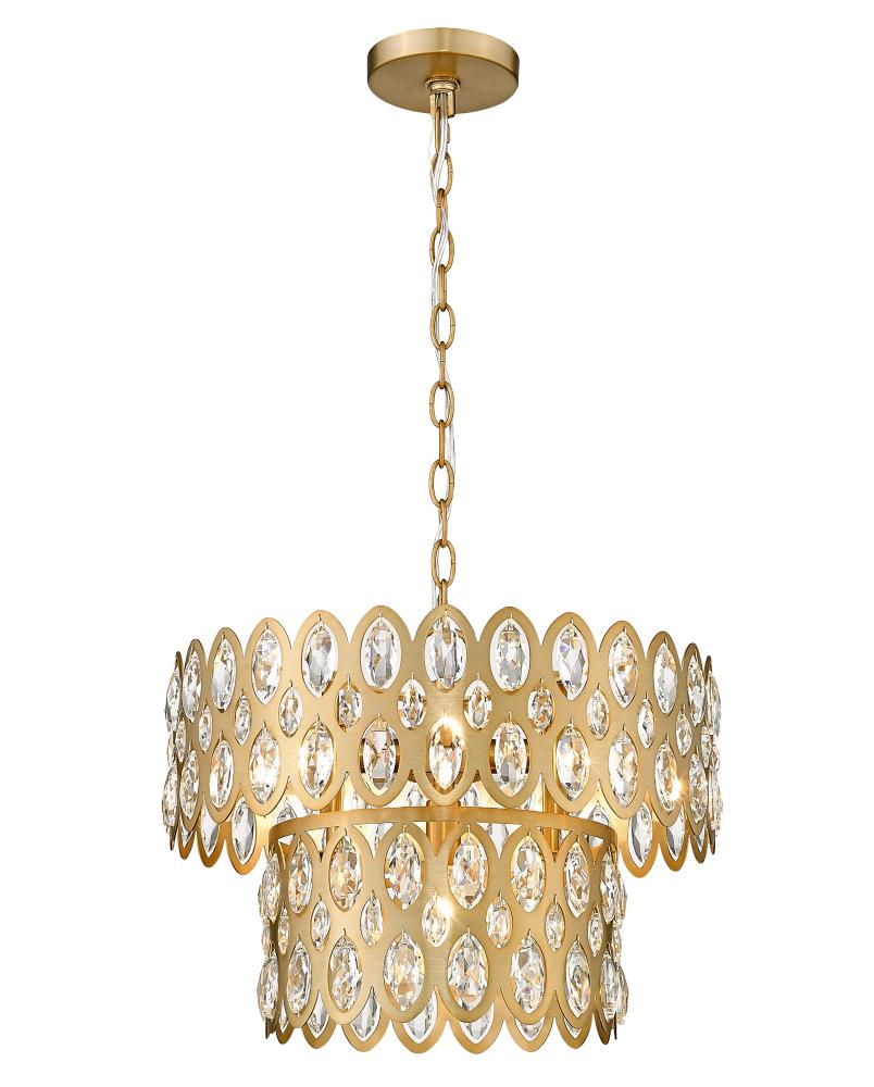 Oval cut-outs are filled with glittering crystals that bring sparkling personality to two tiers in this modern glam five-light pendant. Glowing in warmth, the fixture shows off an heirloom brass finish over steel construction, with a layered look and feel . From the Dealey collection, this glamorous pendant is a perfect fit over a compact kitchen or entryway.