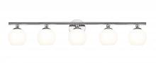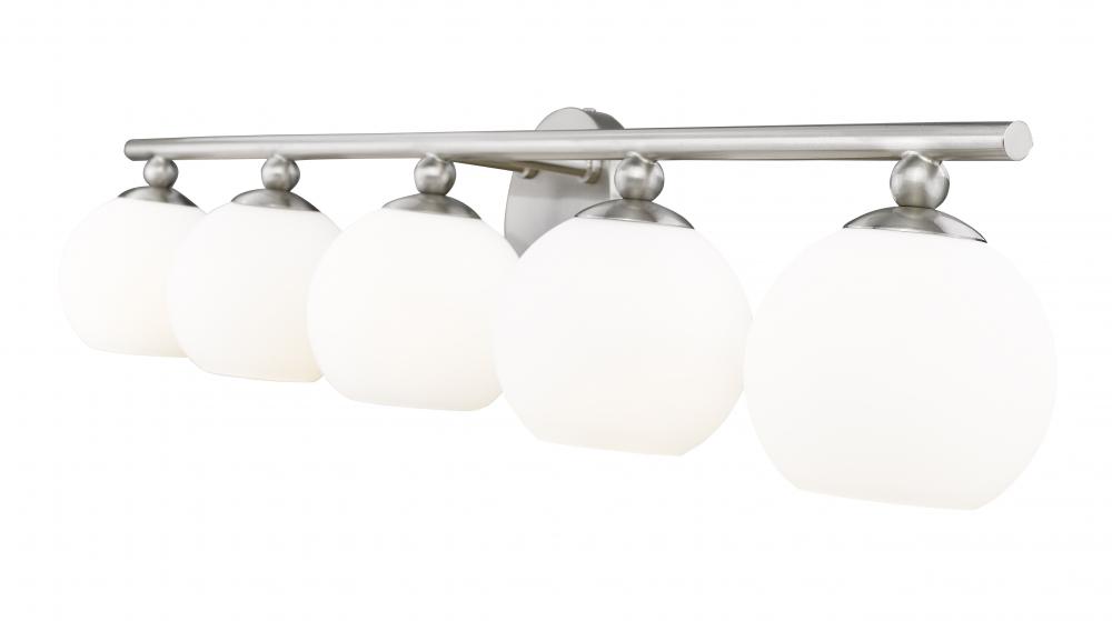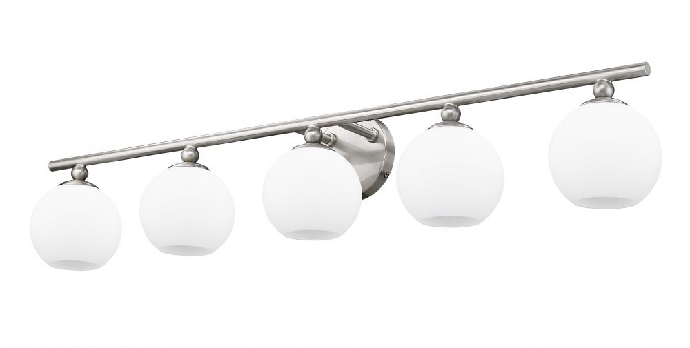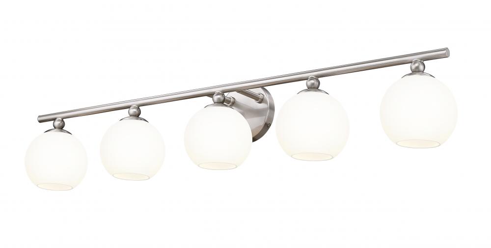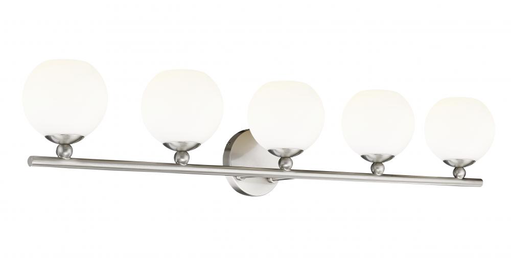 With a sleek brushed nickel finish frame and delicate opal etched glass orb shades, this stylish five-light vanity light from the Neoma collection becomes a focal point in a contemporary ensuite or guest bathroom. A bit of retro influence makes its way into a minimalist classic look with a wide reach aimed at highlighting larger bath vanities.