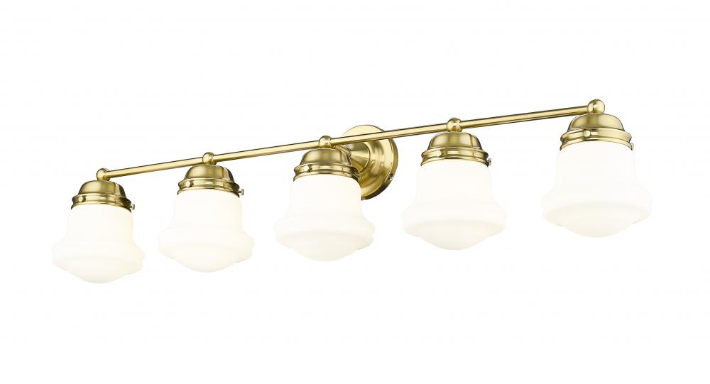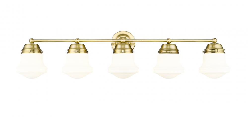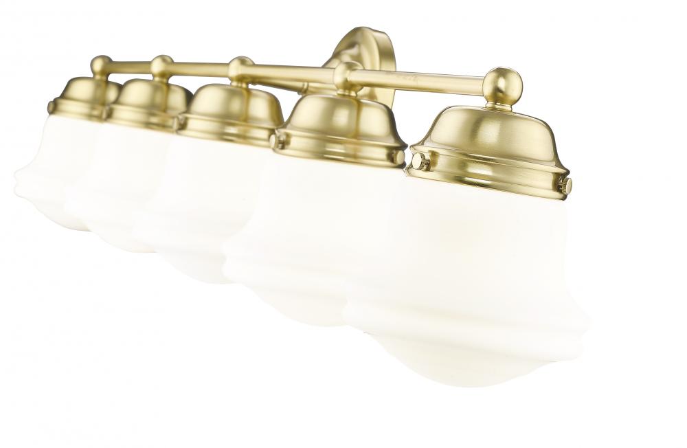 Span our vanity with a modern five-light bathroom fixture that pairs vintage schoolhouse glass with graceful curves to create a chic look and feel. Perfect for a variety of spaces, it showcases matte opal glass for exceptional, diffused illumination and pairs with a stylish luxe gold finish to create a rich, refined ambiance in your bath.