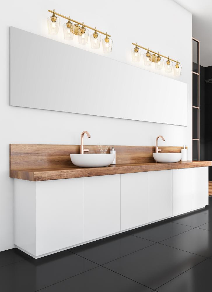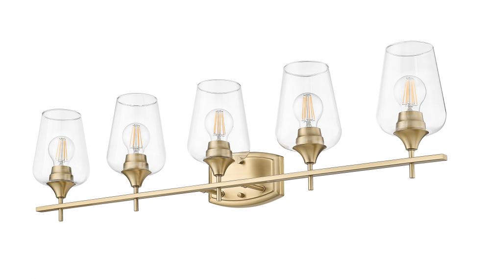Larger master or guest bath spaces play host to a five-light vanity light oriented to delicate sophistication. Beautiful burnished brass finish steel construction forms a linear frame and shapely wall plate, aligning five sparkling clear glass goblet shades filtering dimmable lighting suited to creating a more functional bathroom or dressing space.
