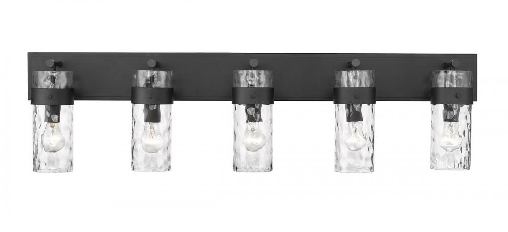 This five-light vanity fixture in matte black will add a warm and inviting glow to bathrooms and hallways. It is made of steel with a glass shade that boasts a ripple texture that catches the eye.