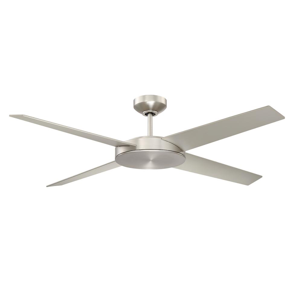 LOPRO 4-blade Ceiling Fan featuring a low-profile motor housing in a Satin Nickel finish with matching blades spanning 52 inches. The silent running DC motor maximizing energy efficiency. An integrated LED Light Kit and Remote Control are also included.