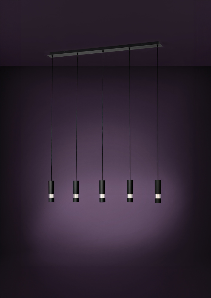 The BERNABETA LED pendant light features five cylindrical shades and a black ceiling mount. In the lower part of each pendant, there is a clear seeded diffuser, which creates a distinctive lighting effect in the room. The pendant light is the perfect finishing touch for modern and minimalist interiors,