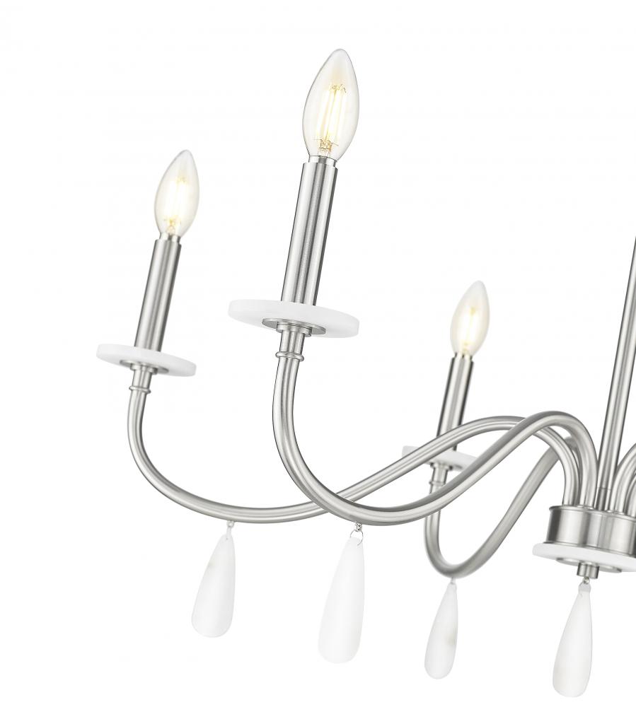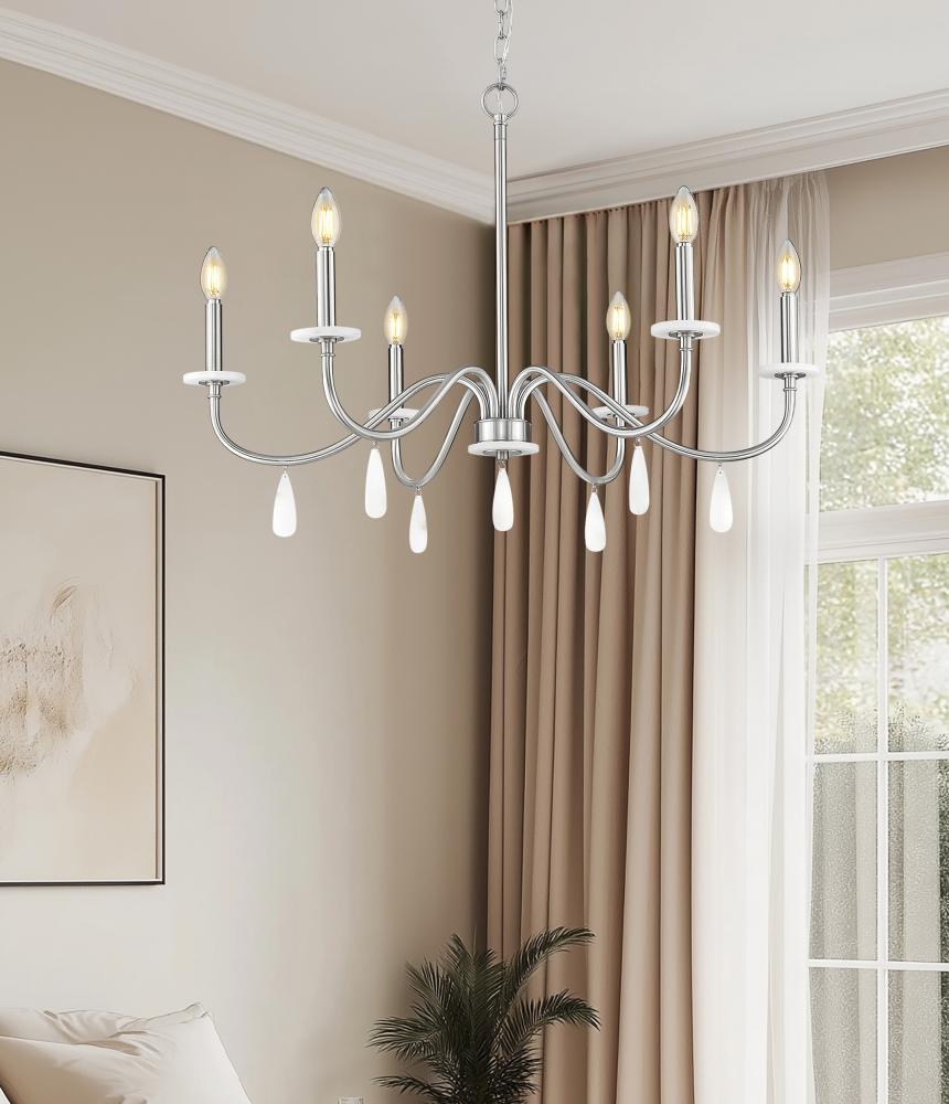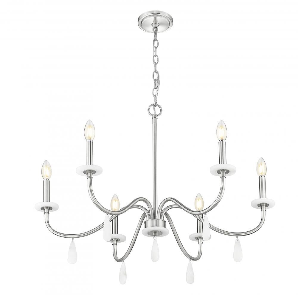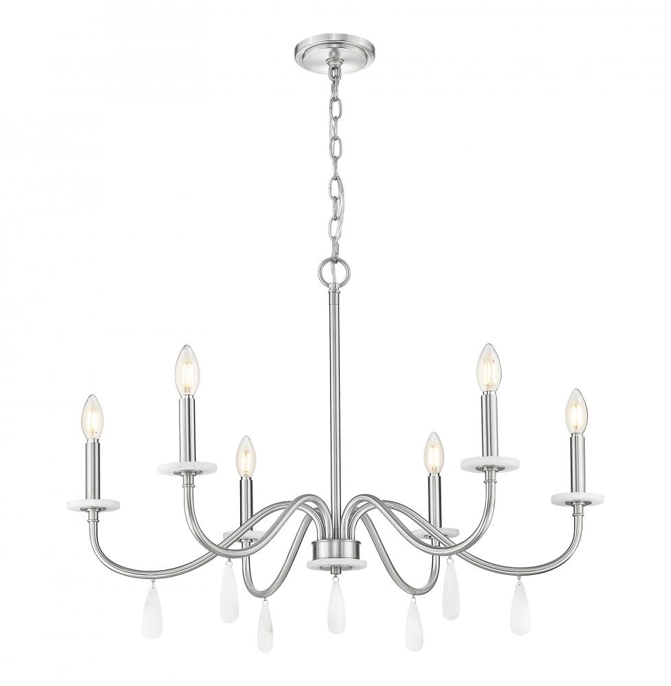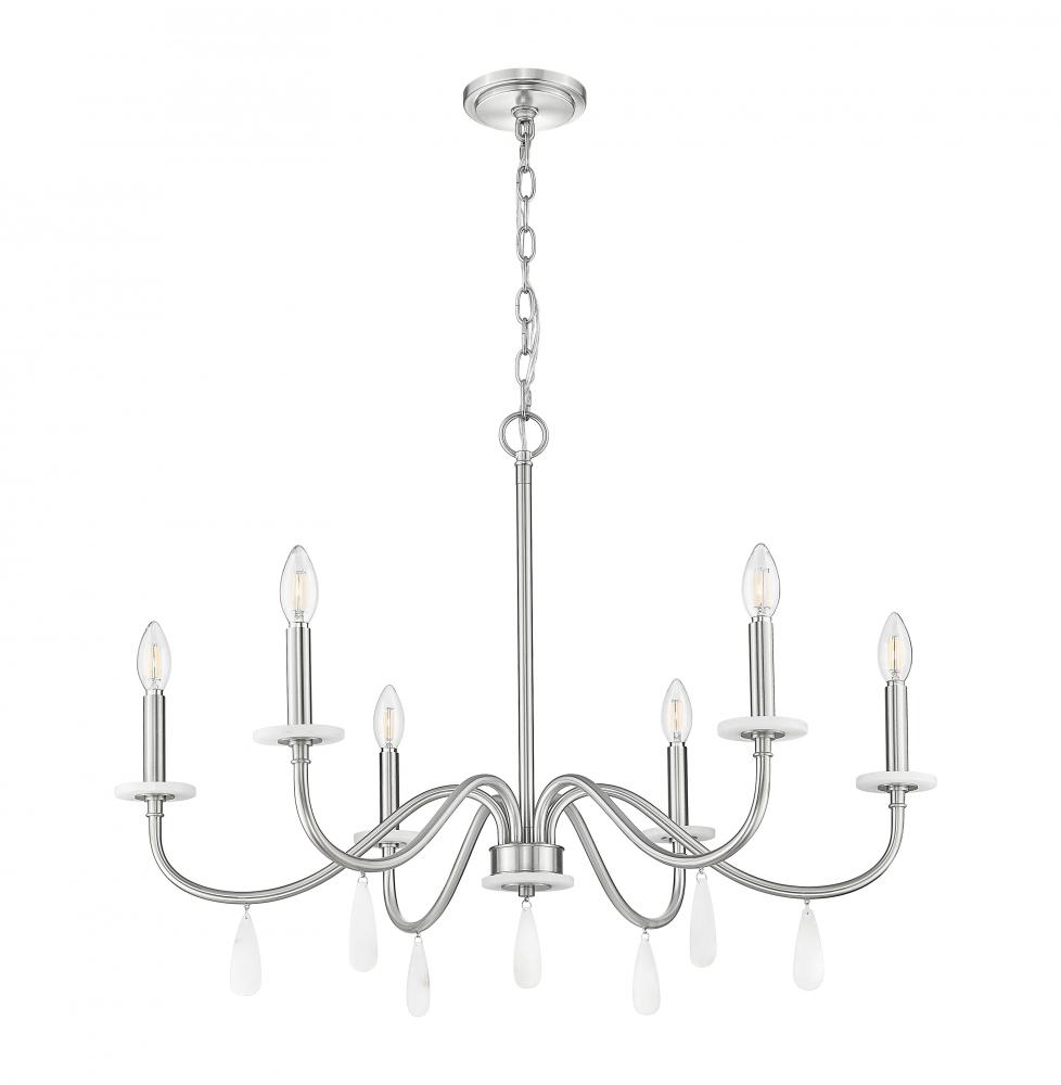 Alluring curves stand out as a silhouette to remember in a six-light chandelier with plenty of versatility. For upscale or low-key dining rooms, living rooms, and foyers, its brushed nickel finish steel frame hosts candelabra holders and alabaster boboches, with decorative droplets catching and reflecting dimmable lighting.