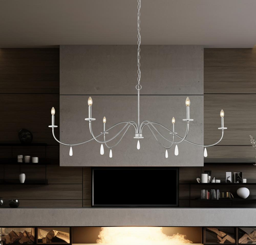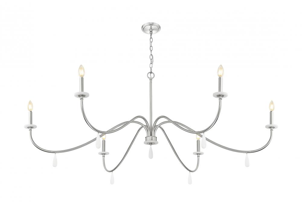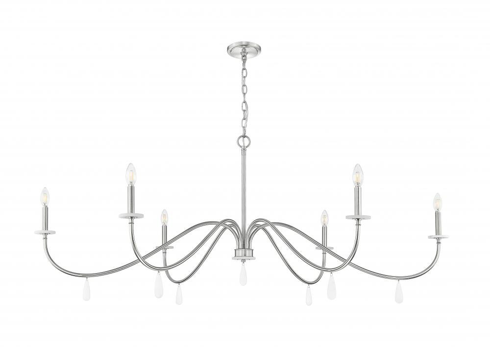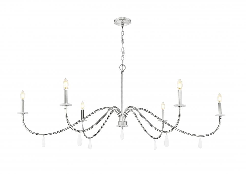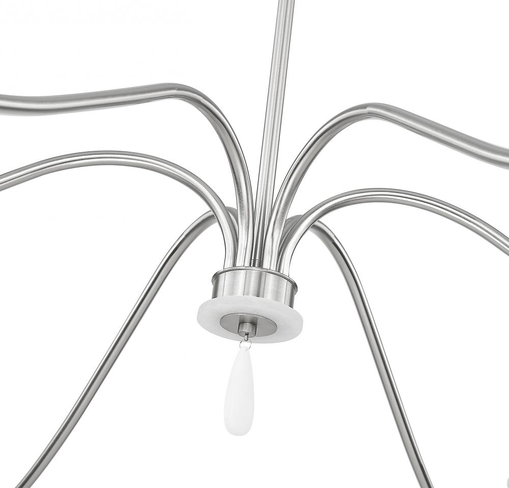 Gracefully curved arms deliver an exceptional silhouette with both glam and sophistication as this six-light chandelier makes a statement in dining rooms, living rooms, and foyers. Brushed nickel finish steel construction welcomes chain suspension, straight holders atop alabaster boboches, and dangling elements below. Make rooms suit occasions with a built-in dimming feature.