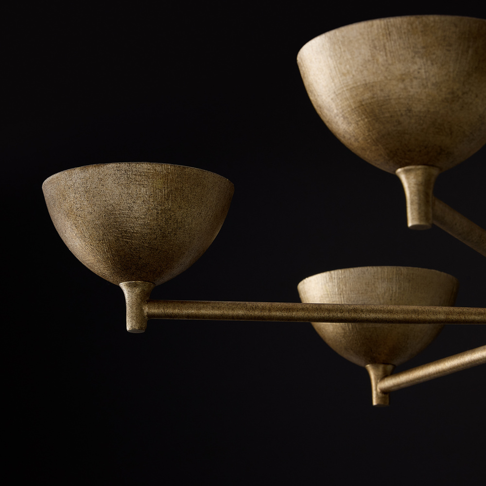 FINISH: A honey-gold brass with champagne highlights, amber low lights, and black undertones in a feathered visual texture, with handcrafted cross-hatched brushed texture on the shades.