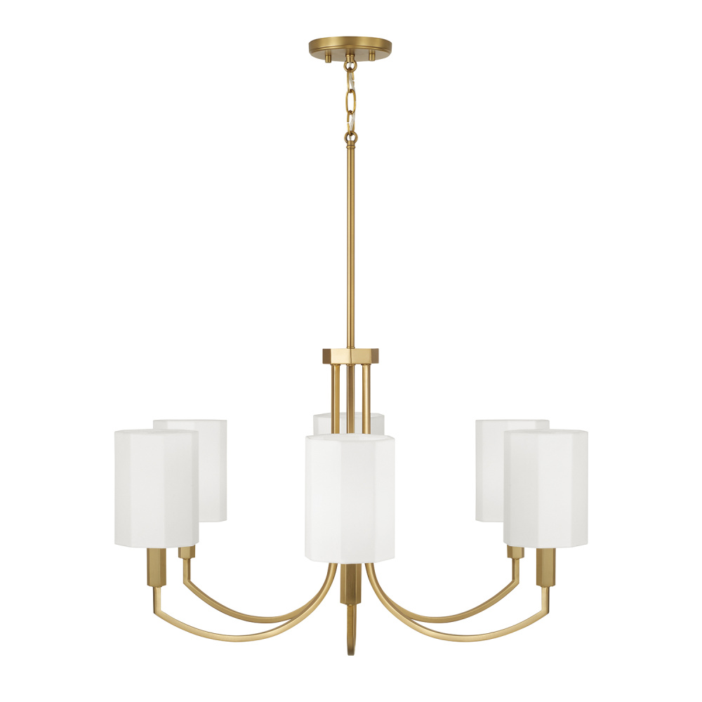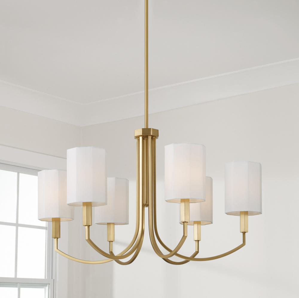 DETAILS: Finished in Aged Brass, the faceted candle sleeves and octagonal White fabric shades bring beautiful dimension to the classic form.