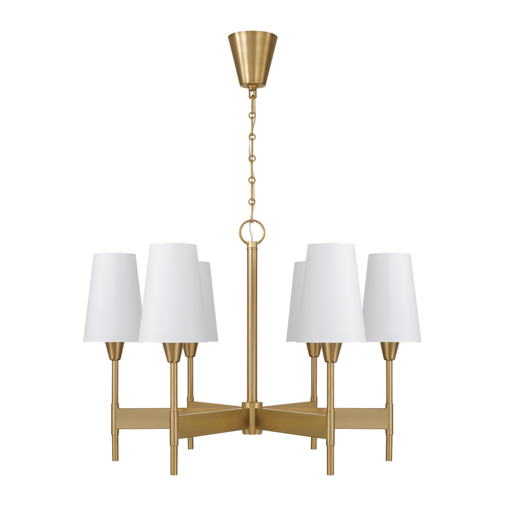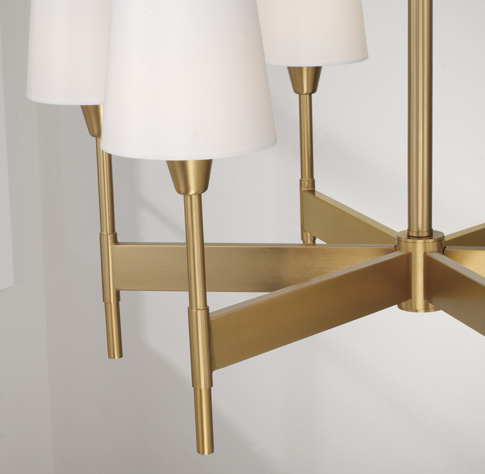 DETAILS: Bold lines and elongated White fabric shades bring a structured, sculptural feel to the classic silhouette, punctuated by tapered socket details and the brushed shine of the Aged Brass finish.