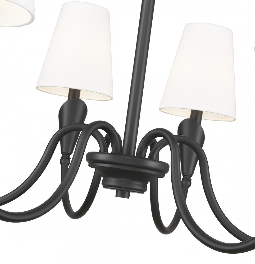 With six gently arched arms and a sleek matte black finish, this chandelier channels the quiet beauty of floral form. Each white linen shade floats like a petal in bloom, creating a warm, welcoming atmosphere overhead. It?s a striking yet subtle piece designed to soften modern spaces and elevate the everyday.