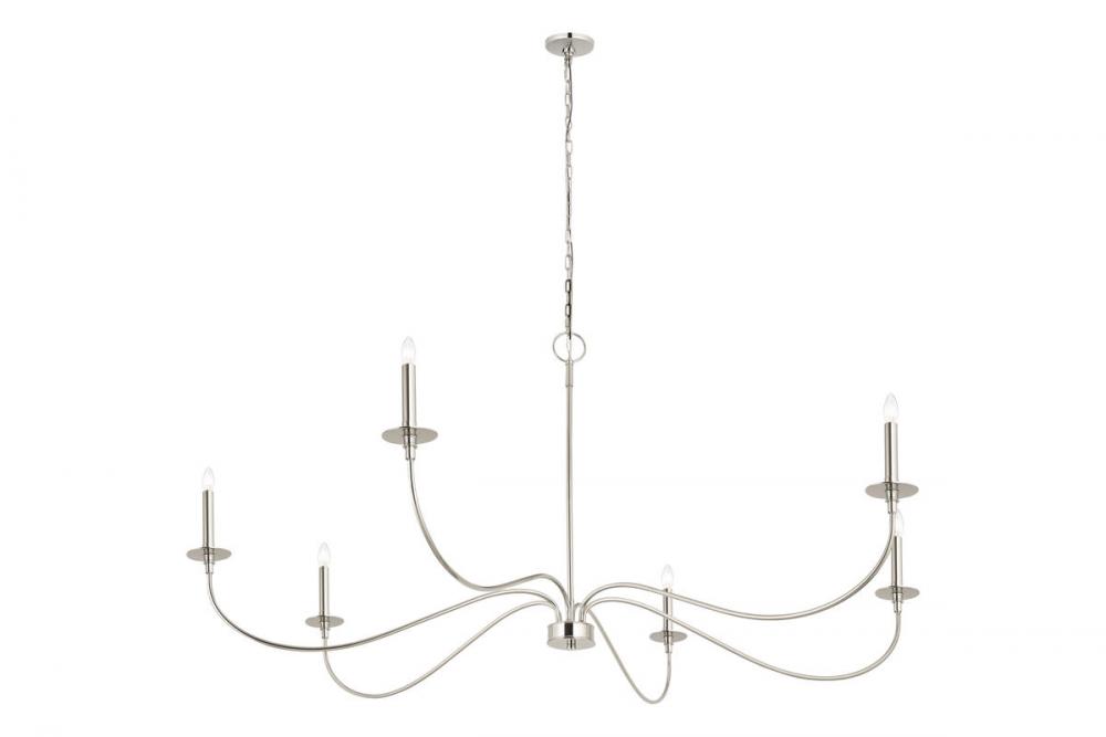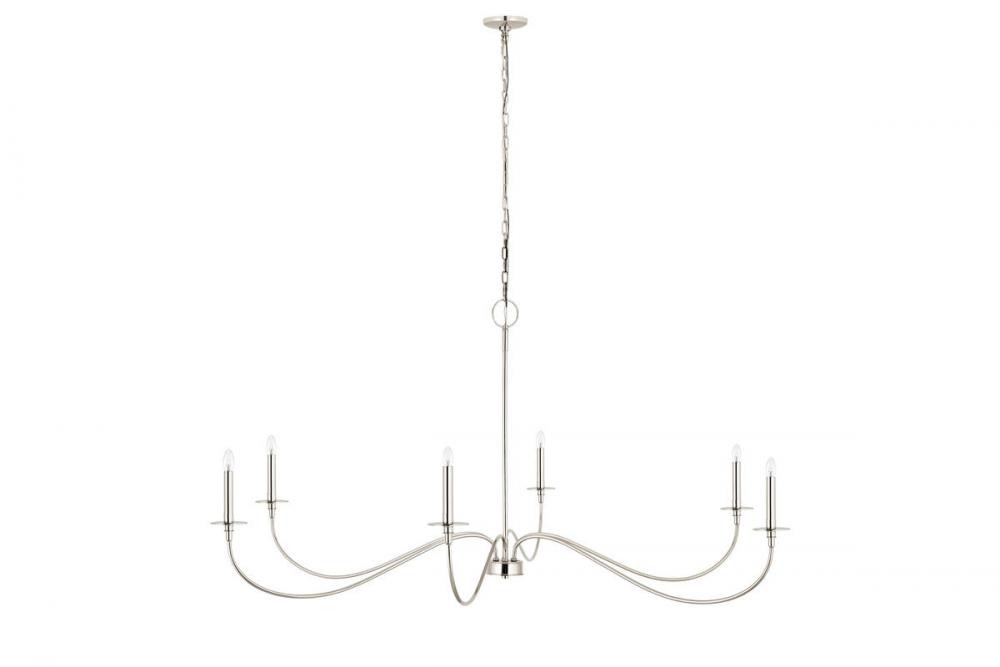 Extreme elegance serves both modern and traditional design schemes with a romantic look when this six-light chandelier delivers graceful charm in a living room, entryway, or dining room. Crafted of classic polished nickel finish steel, its long, flared arms create a careful arrangement for placement of candelabra-style bulbs that borrow from a traditional motif. This chandelier is ideal for larger living spaces.