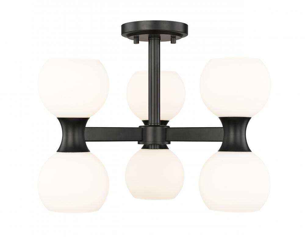 The striking contrast of matte black metal finish and delicate matte opal glass plays out in real time with a light fixture created for impact. This six-light semi-flush mount ceiling light from the Artemis collection draws attention whether placed in a kitchen, dining room, or foyer. Alluring convex curvatures play into an Art Deco theme with a distinct Mid-Century Modern flavor to repackage an iconic design scheme.