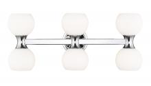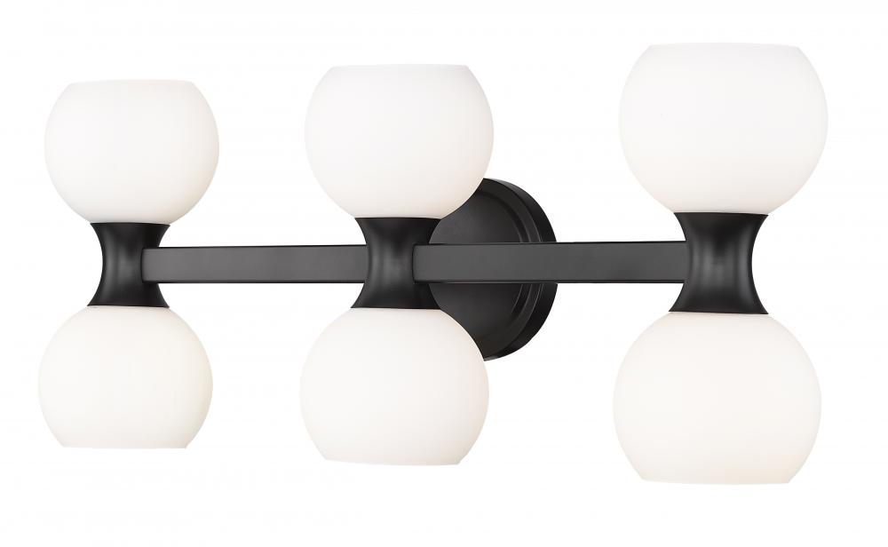 Spot the charming Mid-Century Modern aesthetic with subtle Art Deco style in a six-light bathroom vanity light from the Artemis collection. Follow the delightful convex shapes of a bold black finish steel frame and the delicate flavor of matte opal glass globe shades that form a notable contrasting palette with extra personality. Delivering both uplighting and downlighting, this vanity light brings solid illumination to an ensuite or guest bathroom.