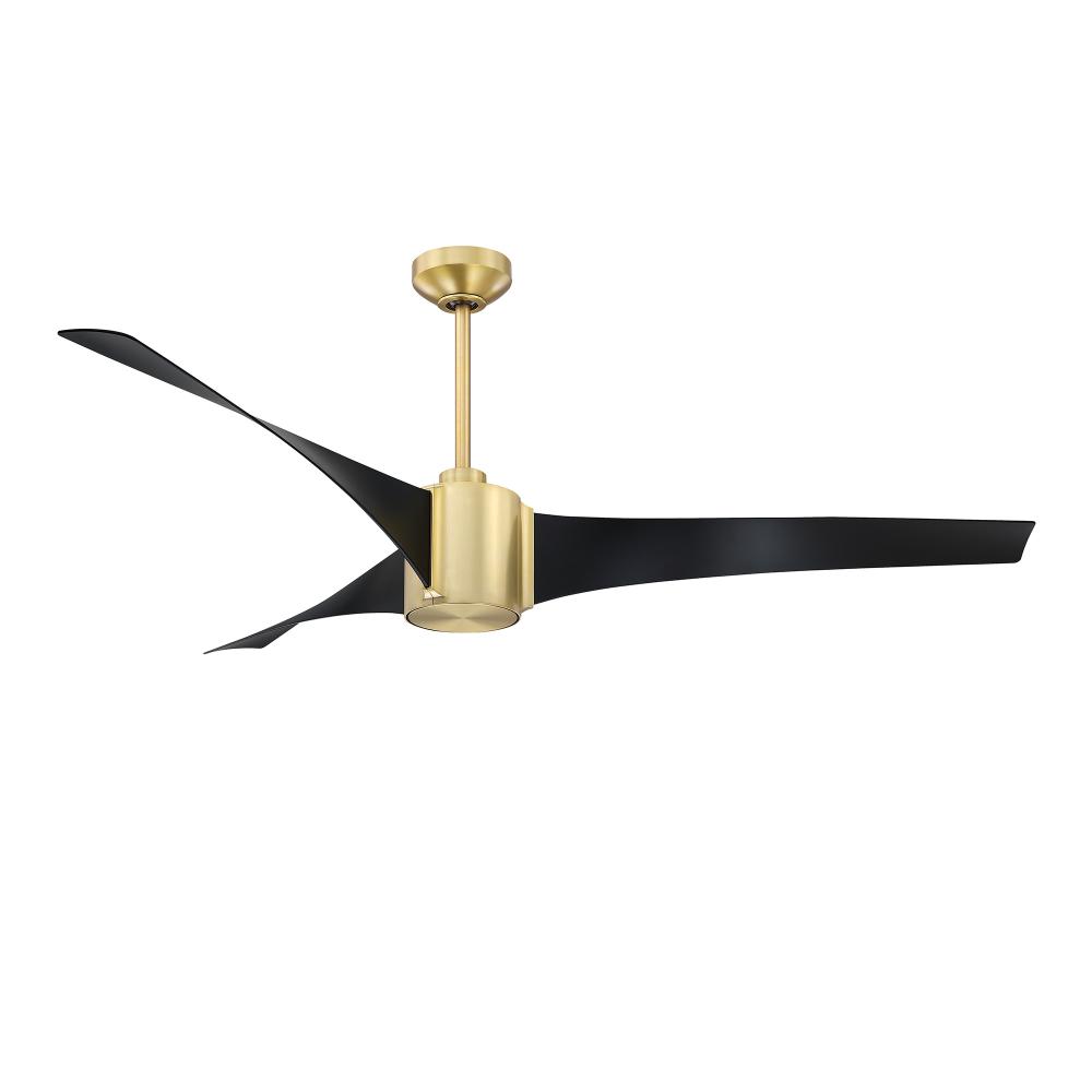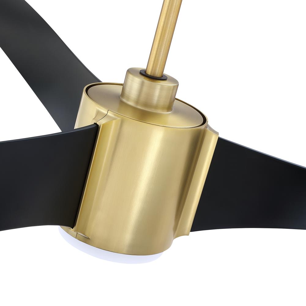 CIMION 60 in. 3 Blade DC Motor Ceiling Fan with Adjustable Color LED Light Kit and Remote Control in a Black & Brass finish with Black blades. The included Full-function Remote Control provides 6 Speeds, CCT (LED Color) Adjustability, LED Dimmer, 2/4/8 Hour Timer to shut Fan off Automatically, and a Variable Wind feature which modulates Fan Speed to simulate a Natural Breeze.