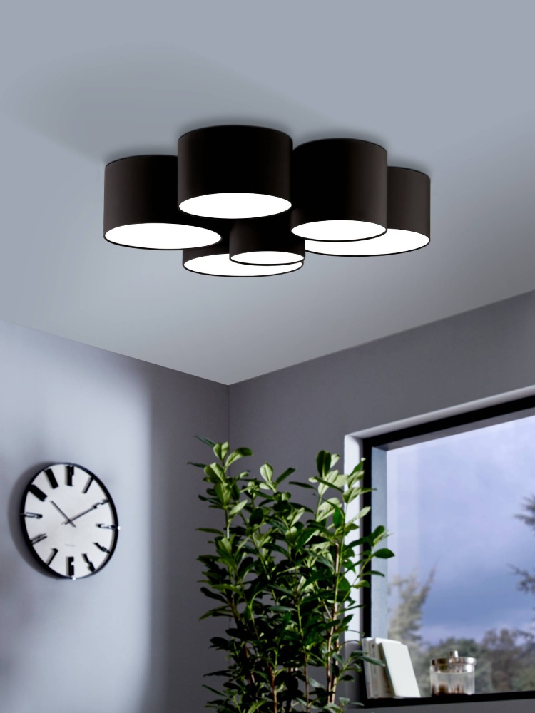 An elegant update of a traditional style, the Pastore 2 ceiling light is a welcome addition to any room. Six black fabric drum shades playfully arranged in a circle are covered with white acrylic diffusers that ensure an even distribution of light and conceal the light bulbs within. The clean lines and classic look can be combined with almost any style, from contemporary to traditional, for a well-lit living room, bedroom, or hallway.