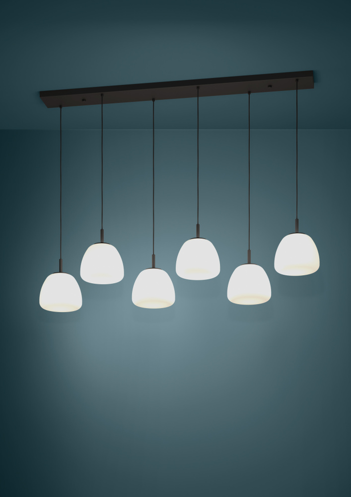 The BALMES pendant has six shades made of white opal glass, each suspended at a different height on a black textile cable from black elongated canopy. The pendant light blends seamlessly with modern interiors and provides stylish lighting in the living room or above the table in the dining room.