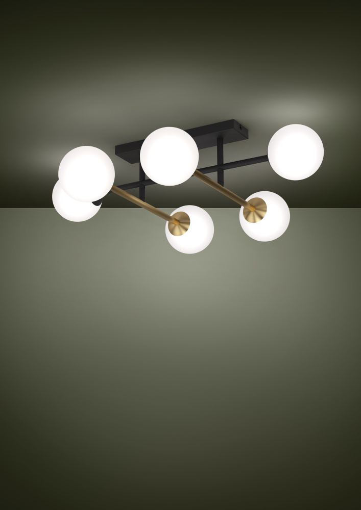 The PAZ ceiling light has a black horizontal rod and two vertical brushed brass rods. These are fitted w/ six white sphere glass shades. The geometirci design complements the light's sylish look
