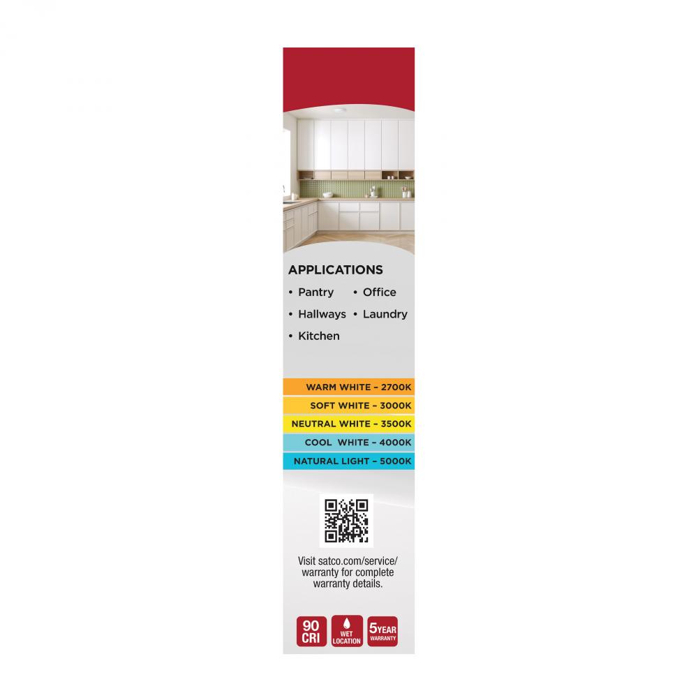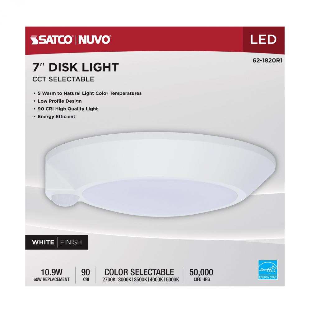 SATCO NUVO's 7-inch white CCT Selectable Disk Light, #62-1820R1, delivers efficiency, convenience, and modern performance in a compact form. With five selectable color temperatures (2700K/3000K/3500K/4000K/5000K), this fixture easily adapts to a wide r