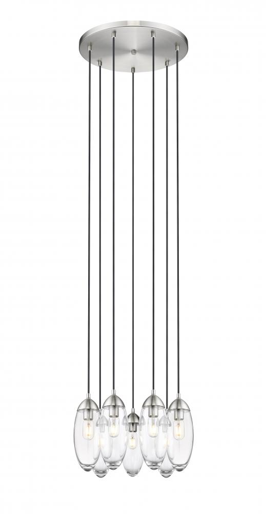 Decadence softened with minimalism becomes a natural choice in lighting as this seven-light round chandelier creates eye-catching beauty. Circular clustering of delicate glass teardrop shades and a brushed nickel finish metal canopy form a minimalist silhouette with maximal impact, offering pure organic inspiration. Highlight a nook or reading space with this exquisite chandelier accented with gleaming metal.