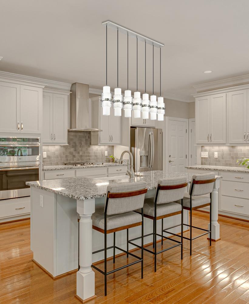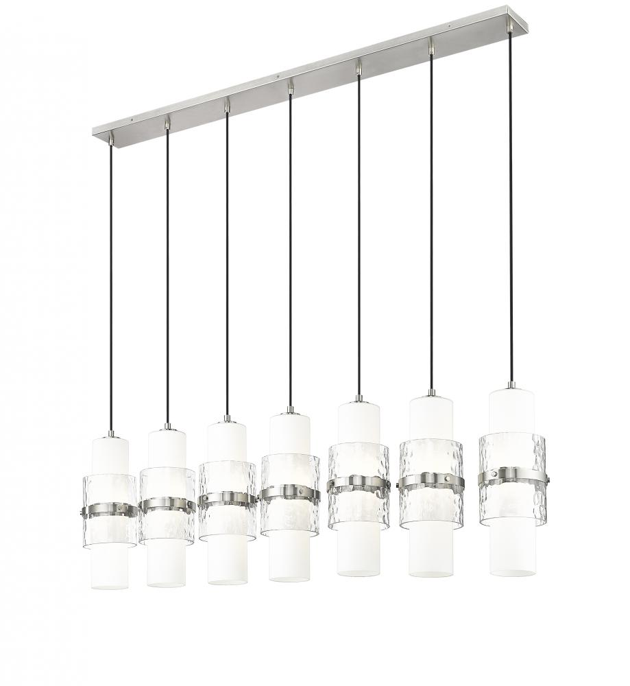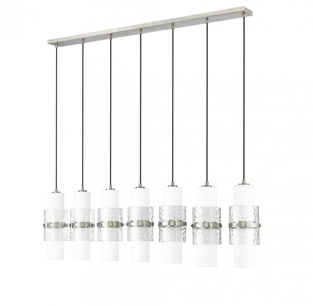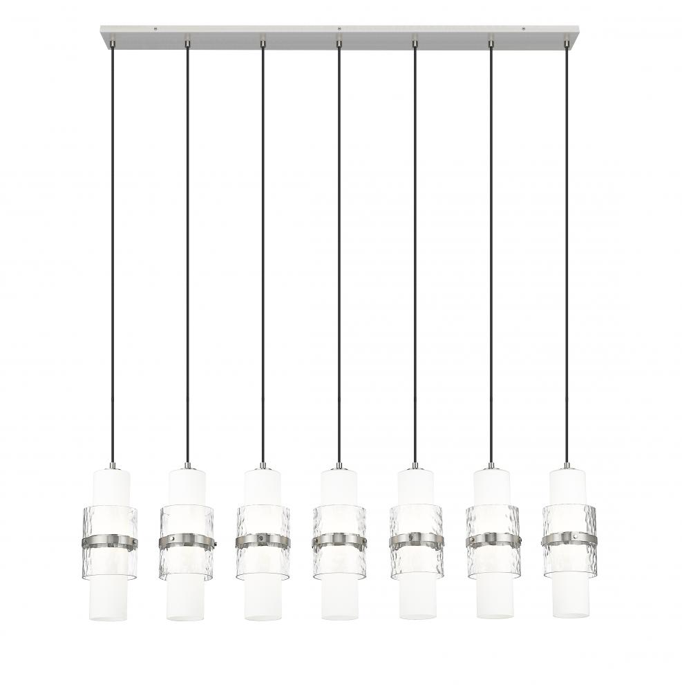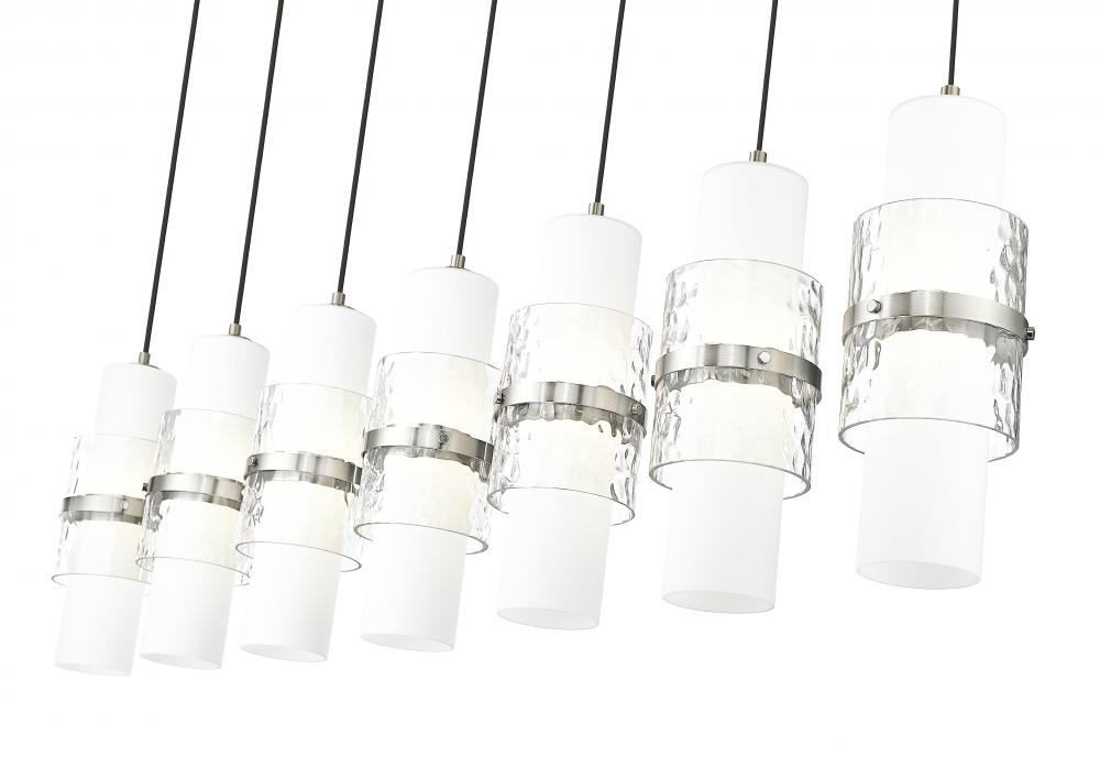 A modern style with a classic touch, the Cayden family features an opal white glass cylindrical shade, next we add a cylinder of textured glass finished off with a decorative cuff, and suspended with black braided cloth-covered cords that complete the stun