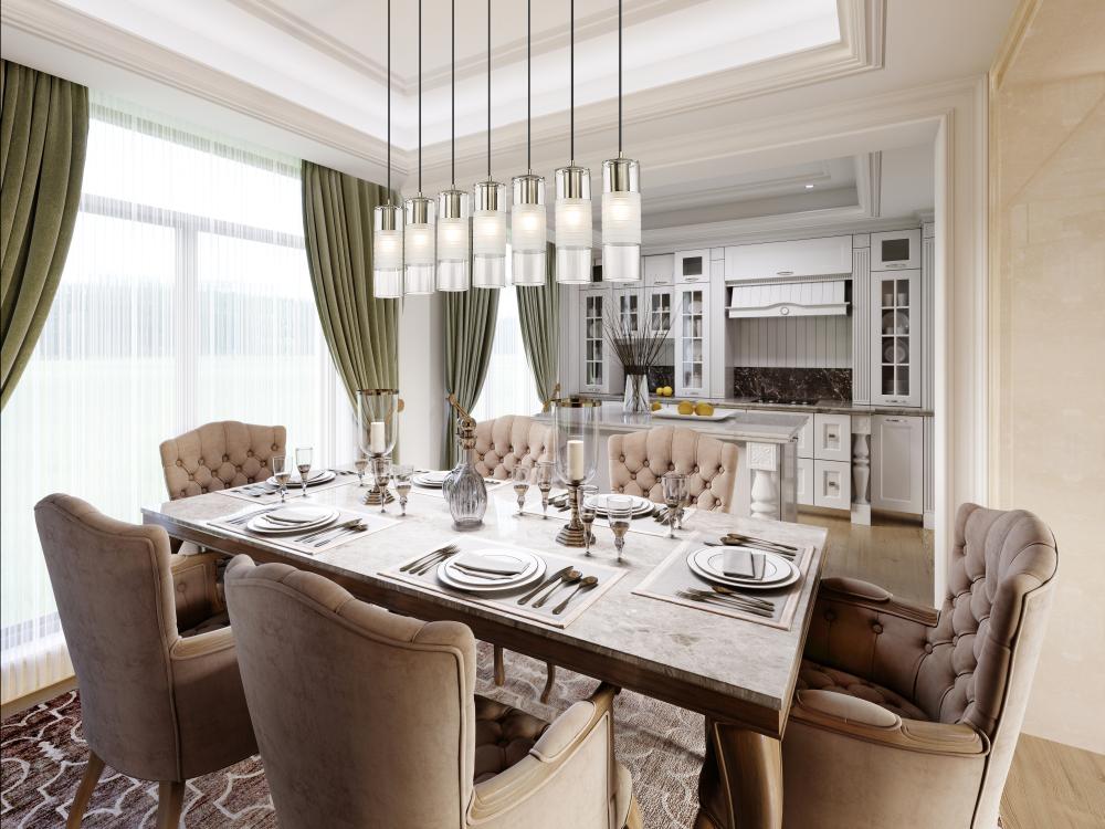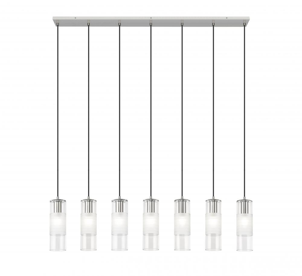 Instill a refined sensibility over a kitchen island or dining table with a modern seven-light linear chandelier. Impeccably designed with artisan clear and frosted glass shades and robust housings, the chandelier features a long, slim canopy and a timeless brushed nickel finish. Each light suspends from a covered in braided cloth, lending impeccable tailoring and attention to detail to this superb fixture.