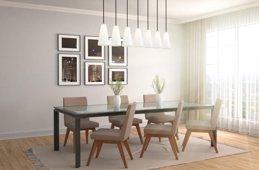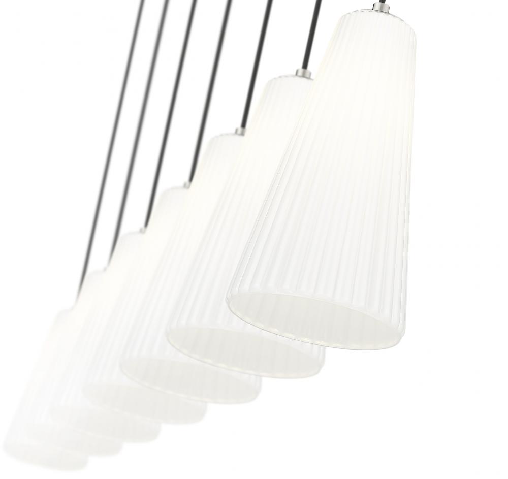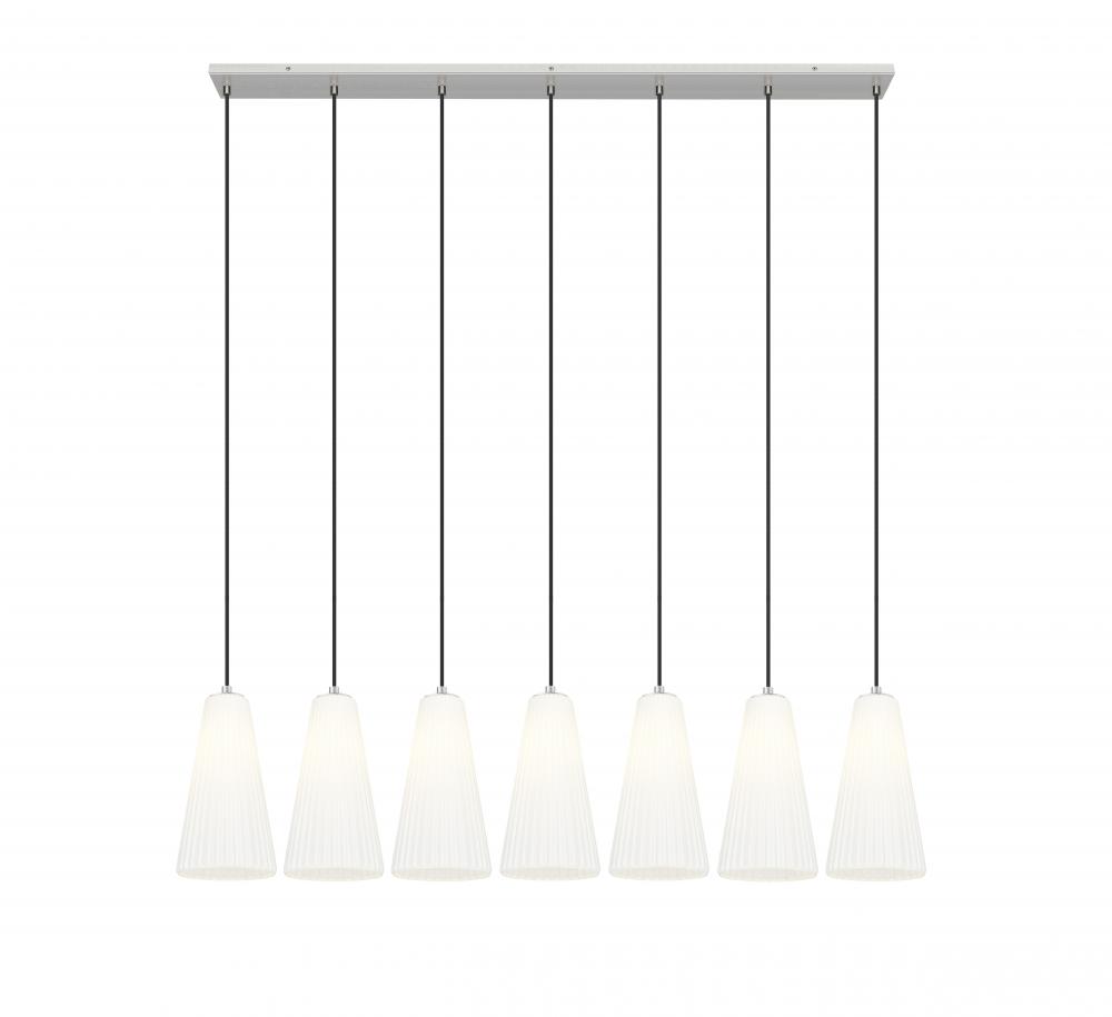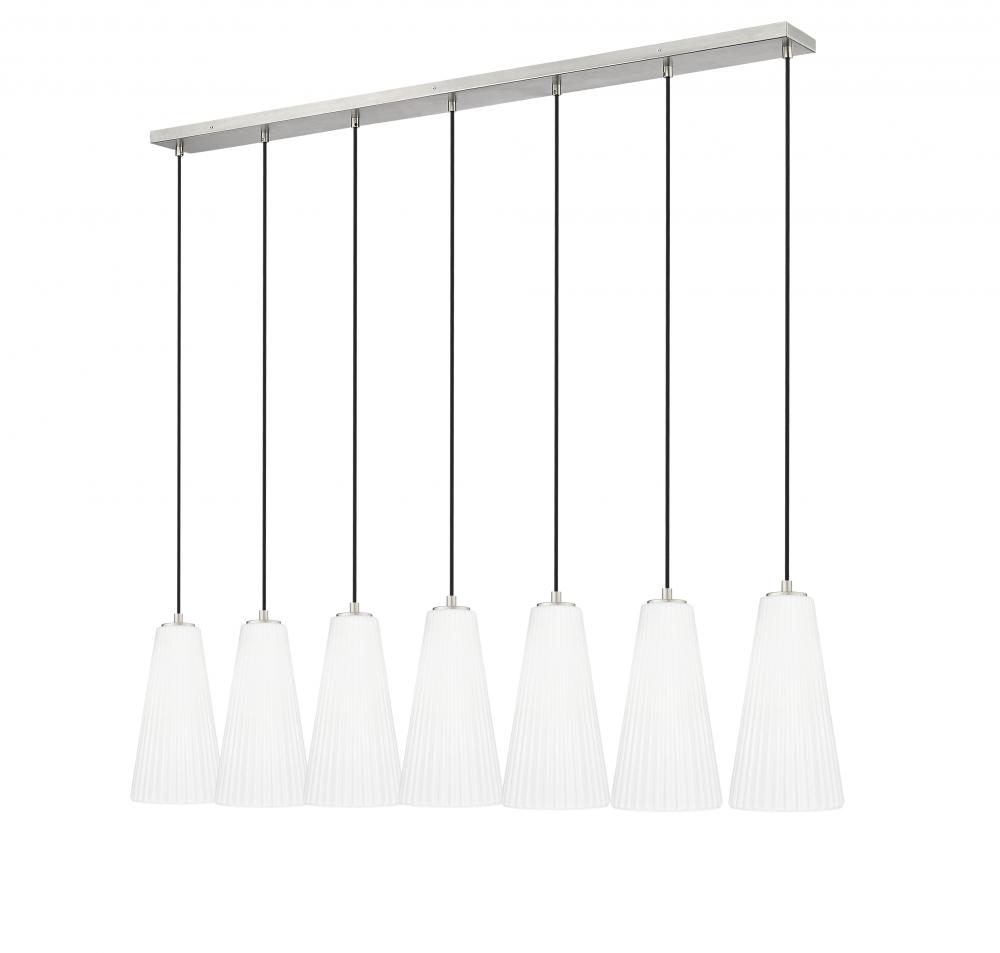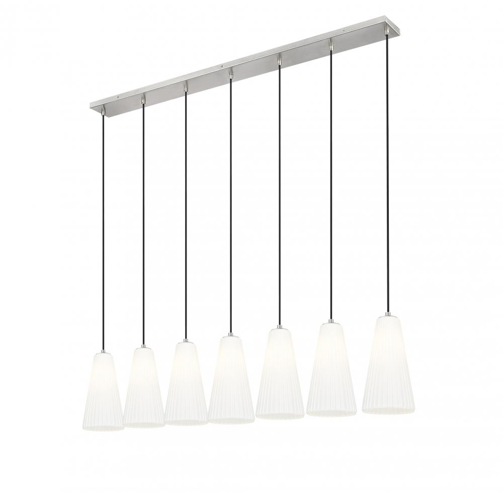 A supremely sophisticated silhouette is created for this modern seven-light island chandelier with its gently flared and fluted white glass shades. It features a refined brushed nickel finish and slim cords that suspend each light at an equal height, creating symmetry over a dining table or spacious kitchen island. Clean lines make this a versatile style choice, blending beautifully in spaces that range from traditional to contemporary.