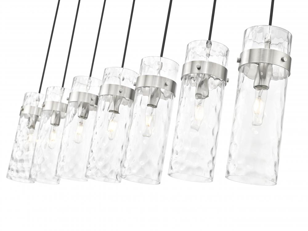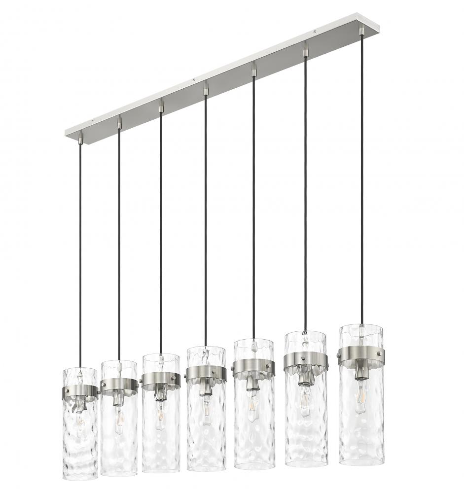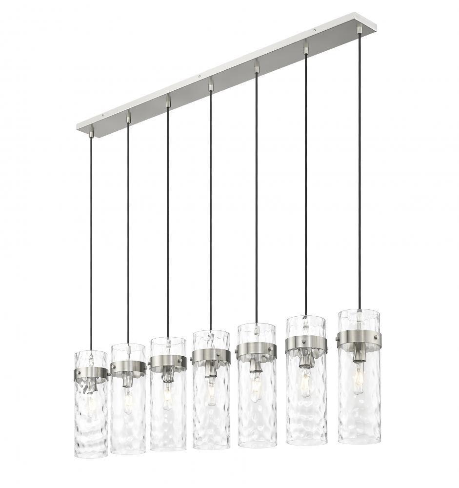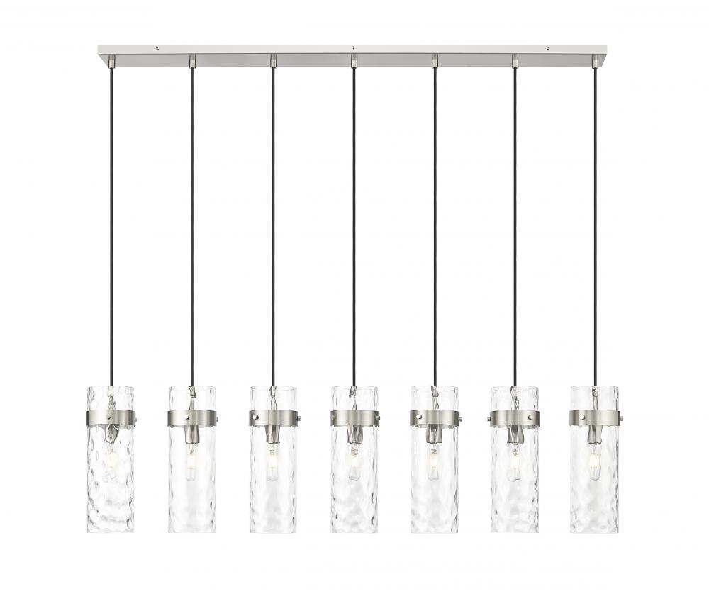Span a generous space with the linear silhouette of this modern seven-light chandelier. Its clear water glass shades add dimension and opulence, while a cool brushed nickel finish and braided cord set a refined ambiance over a kitchen island or dining table.