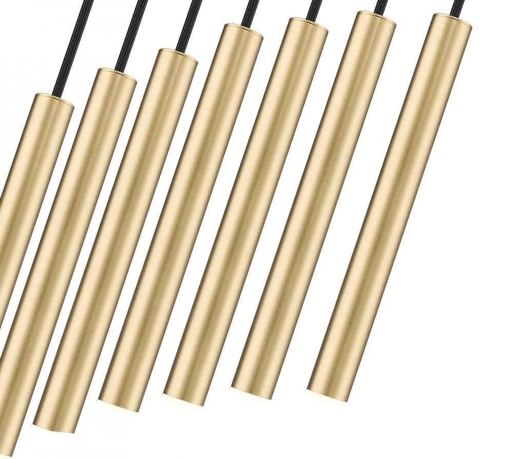 A modern gold finish sets a refined, inviting tone for this contemporary seven-light linear chandelier. Featuring energy efficient LED lights in slim housings, this minimalist design is ideal over a kitchen island or dining table, delivering both sophisticated style and dimmable illumination.