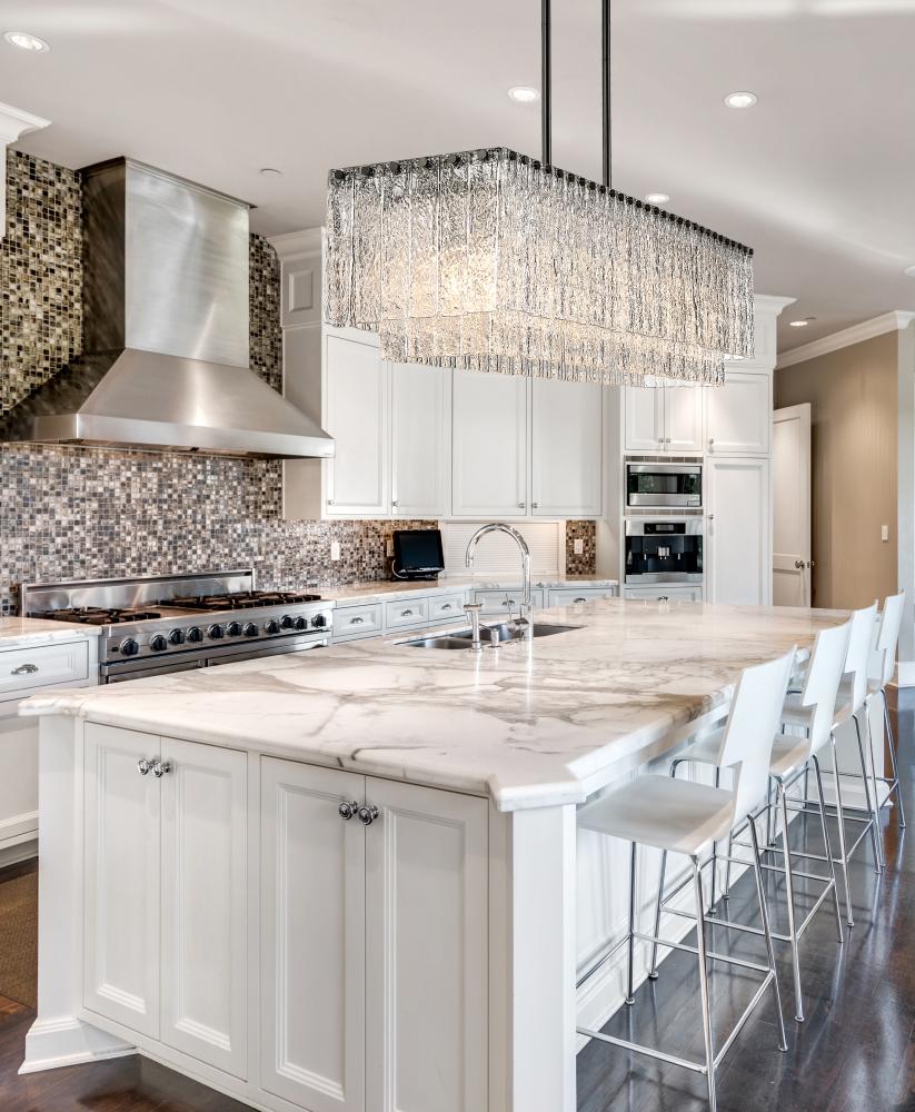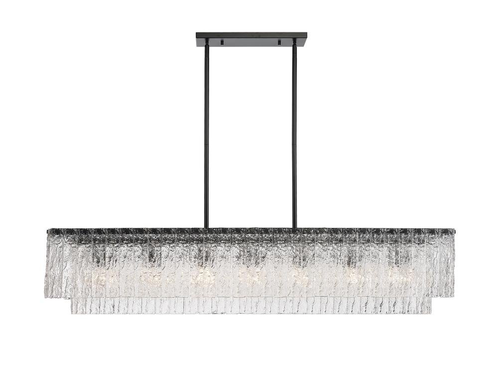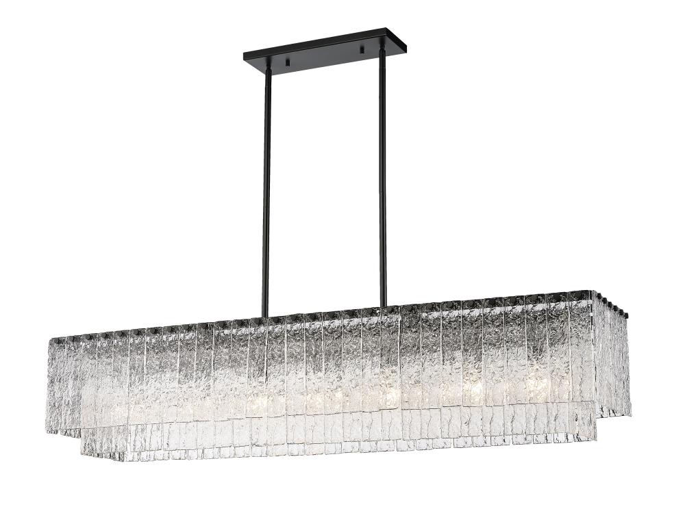 Sensory perception reflects a glam feel with minimalism driving its narrative, turning this seven-light island light into a premier fixture. The Glacier island light offers a decadent look of individual textured glass panels that emulate melting ice, an extraordinary effect with dramatic impact in a kitchen or bar space. Matte black finish steel creates a bold frame and canopy, adding a contrast in both style and finish, embellishing the optical delight accomplished when the fixture is illuminated.