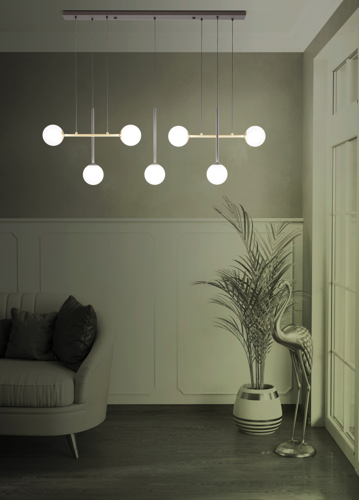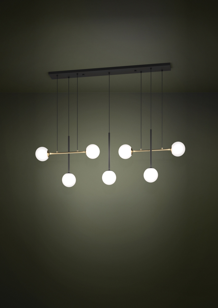 The PAZ pendant features two intersecting rods in a black & brushed brass finish, suspended on black textile cables from a black canopy. The pendant has seven white glass spheres shades, w/ one positioned at each end of the rods. In the middle hangs a single black rod suspended vertically, which complements the light’s stylish and compelling look.