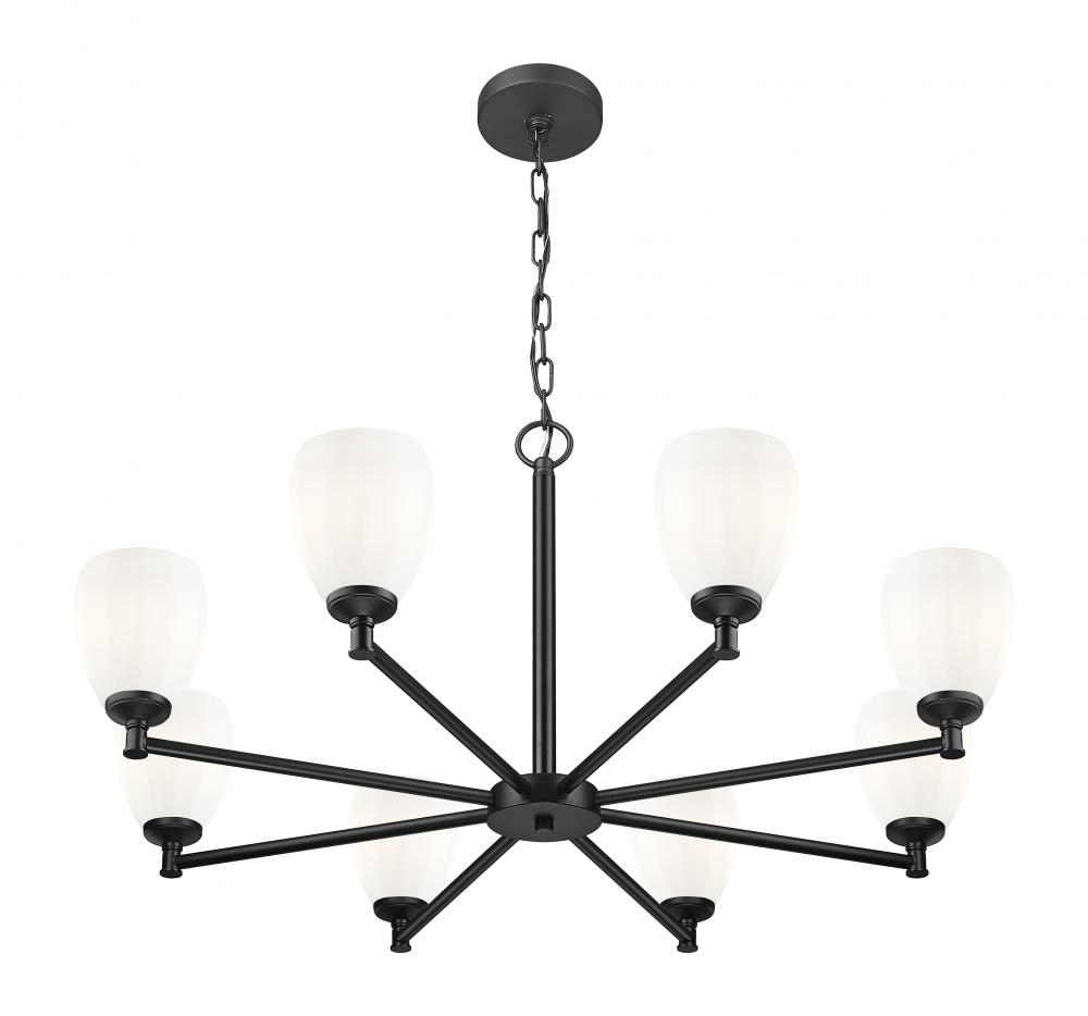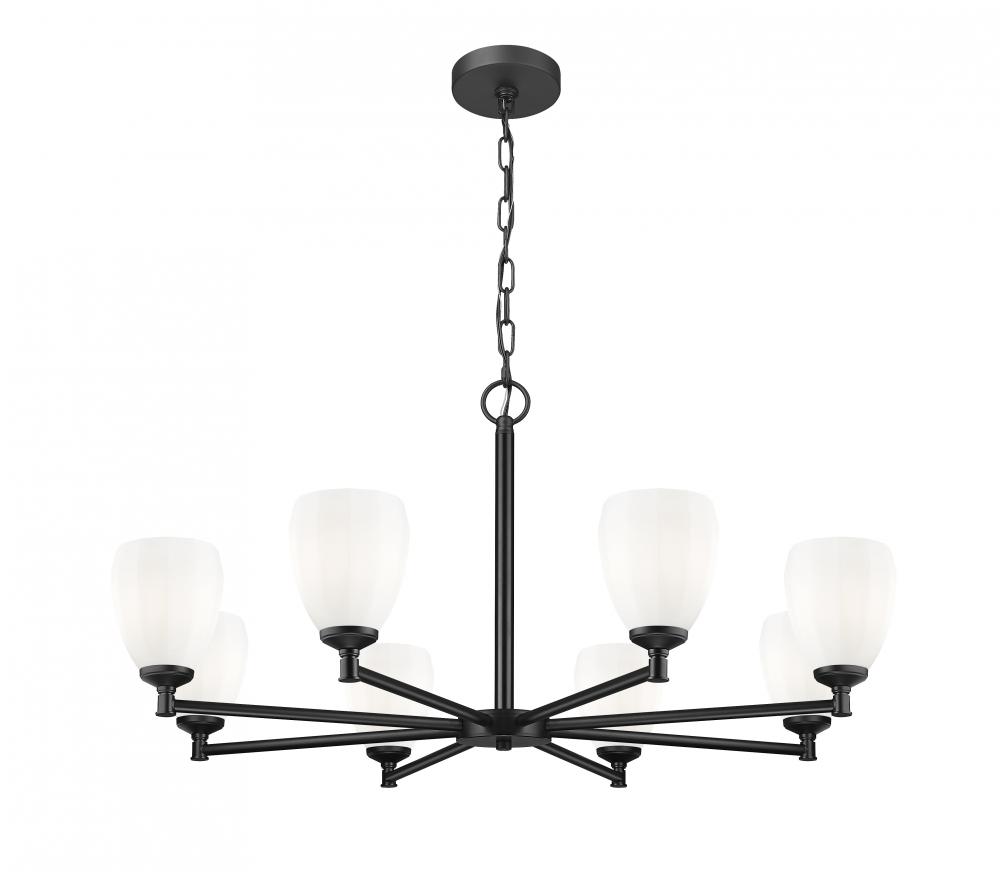 Clean lines and fresh style infuse a modern eight-light round chandelier that presents a versatile focal point for your entry or dining room. A steel frame features a matte black finish, drawing the eye and offering ample contrast and dimensionality. Shades are matte opal glass, crafted with a faceted design that adds unique flair while ensuring soft, diffused illumination for any setting.