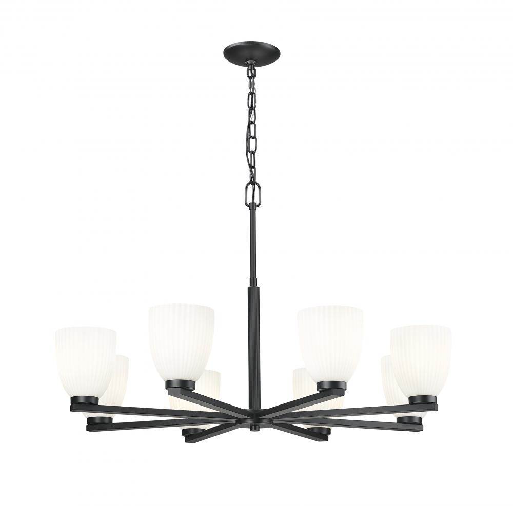 This eight-light chandelier pairs a dramatic matte black finish with the soft, sculptural presence of matte opal glass. Ribbed shades add depth to the glow, diffusing light into smooth, layered ambiance. It?s bold, architectural lighting that centers the room with intention.
