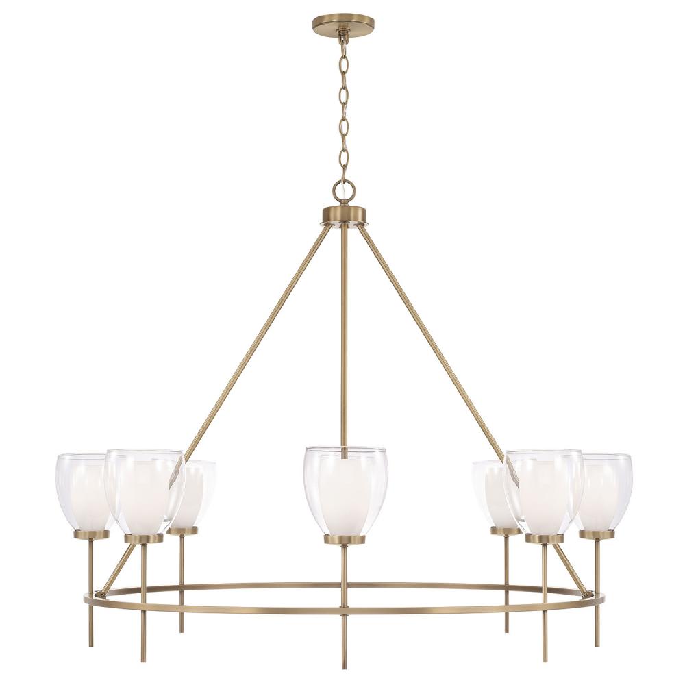 Chic curves and stunning details create the Joss Large Chandelier. The layered Soft White and Clear glass delivers glamorous dimension, while the Aged Brass finish adds visual warmth to the sleek lines for an all-around captivating luminaire.