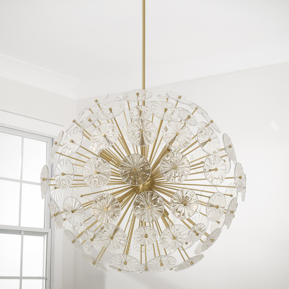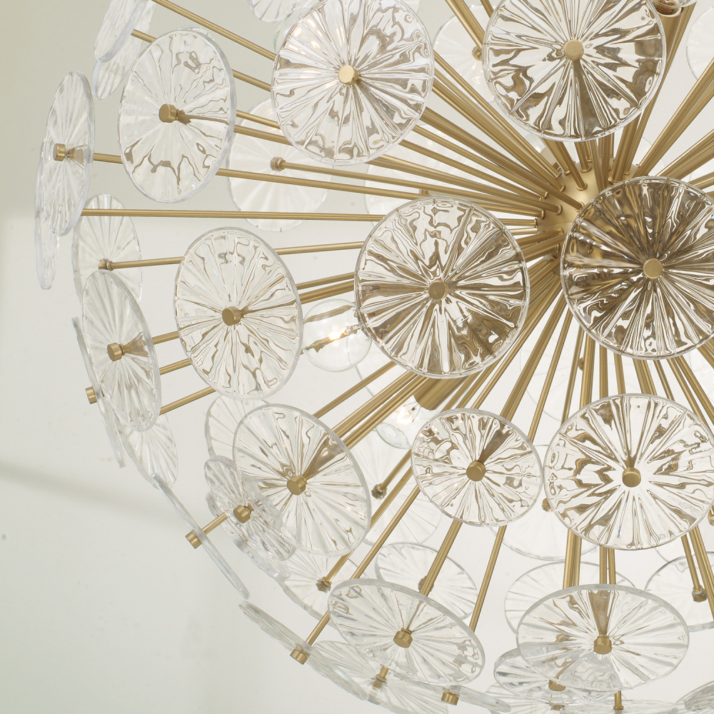 DETAILS: Held by succinct Matte Brass stems, the clear pressed glass petals form a starburst of patterned illumination, bringing elegance to any space.