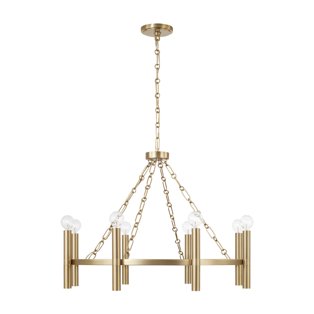DETAILS: Finished in Matte Brass, the extended candle sleeves and unique designer chain details create high style in a classic ring silhouette.