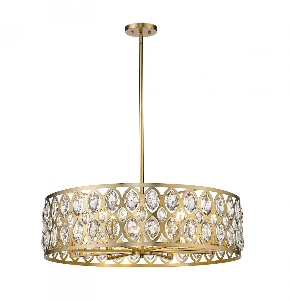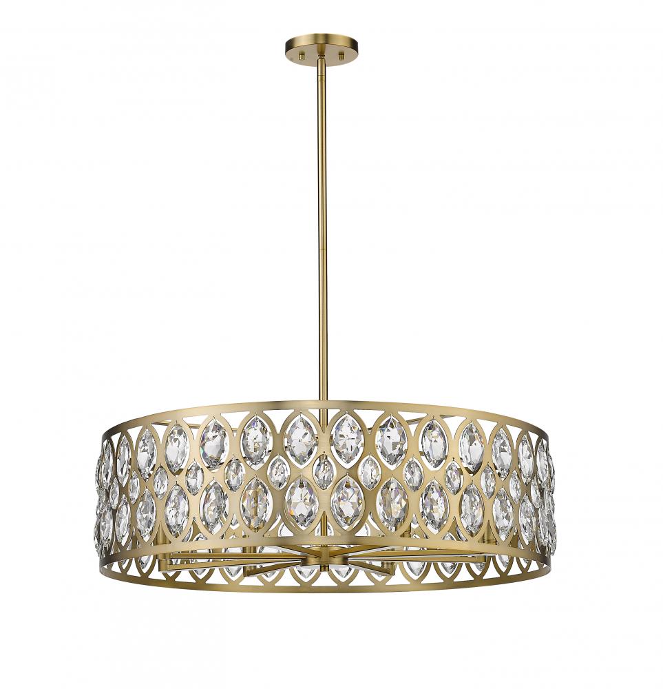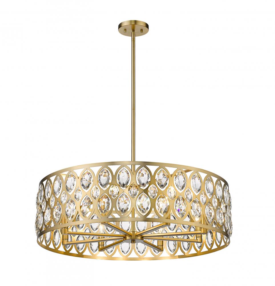 From the Dealey collection comes this elegant and wide eight-light chandelier. Featuring a round steel shade in a warm heirloom brass finish, this lighting piece exhibits a punched ellipse-style pattern, set with shimmering clear crystal pendants. This alluring and charming, contemporary chandelier lends a sophisticated flair to a dining room or living room.